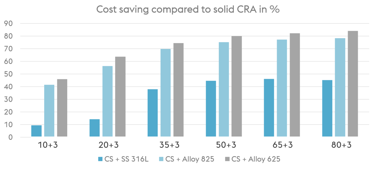 Im Vergleich zu korrosionsbeständigem Vollmaterial (CRA) bieten walzplattierte Bleche signifikante Kostenvorteile.