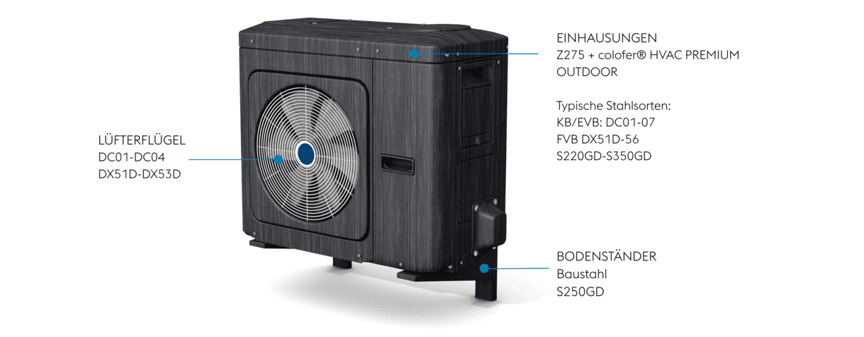Unsere Stahlprodukte finden sowohl im Außen- als auch im Innenbereich von HVAC-Geräten Anwendung. Die vielfältigen Einsatzmöglichkeiten unserer Stahlsorten lassen sich am Beispiel einer Wärmepumpe verdeutlichen.
