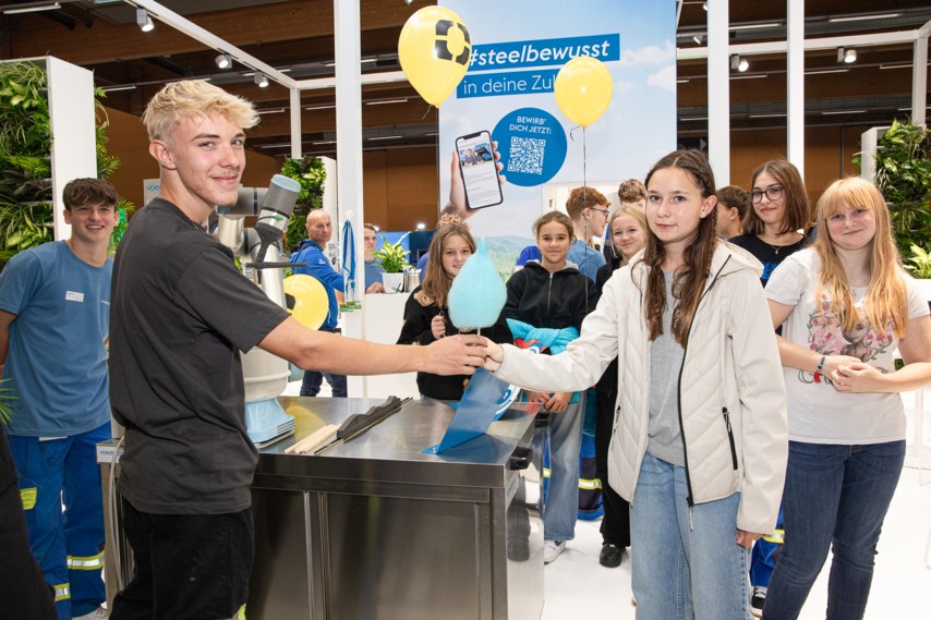Ein Schweißroboter wurde im Zuge eines Praktikums zum Zuckerwatteroboter für den Auftritt auf der Messe Jugend & Beruf umprogrammiert. Diese neue Funktion erfreute nicht nur Naschkatzen und Zuckerjunkies, sondern gibt einen Vorgeschmack auf die Programmierfähigkeiten unserer Ausgebildeten. Ein Gewinnspiel lockte mit coolen Preisen wie Snipes Gutscheine und steelbewussten Tennissocken. Damit lassen sich Schritte voraus gehen.