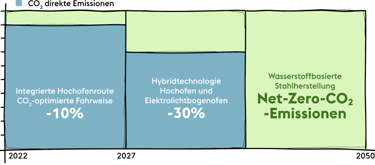 Die Umstellung auf einen Stahl-Herstellungsprozess mit Net-Zero-CO2-Emissionen geht nicht von heute auf morgen. Deshalb teilen wir uns den Weg in kleinere Etappen ein und kommen unserem großen Ziel so schrittweise immer näher: Die Stahlproduktion mit Net-Zero-CO2-Emissionen bis 2050. Unser Weg ist klar vorgezeichnet, jetzt müssen wir ihn gehen – gemeinsam mit Ihnen.