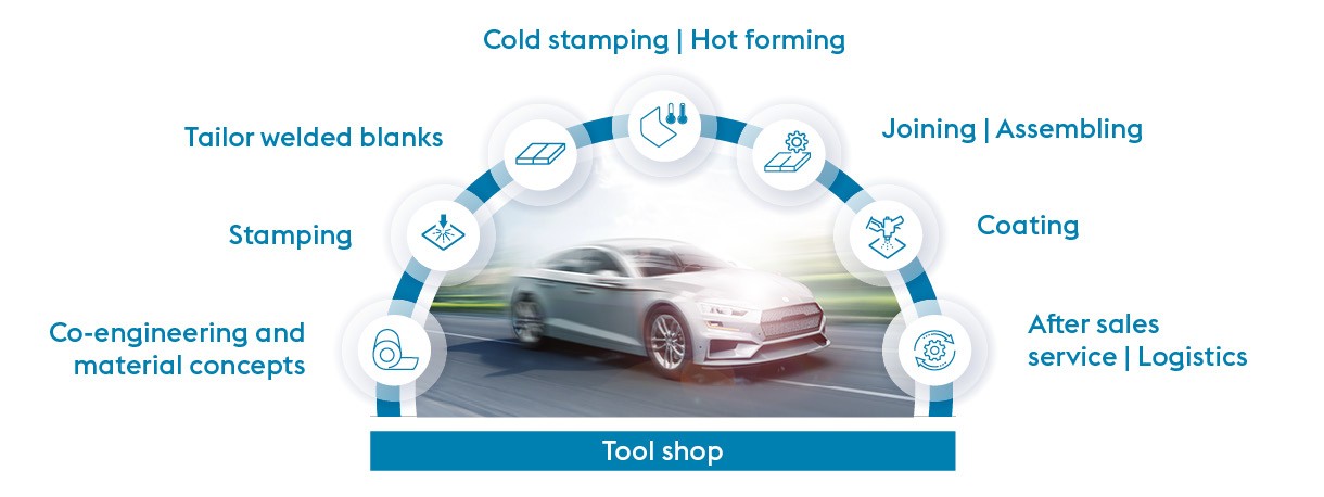 For more than 4 decades, we have combined co-engineering expertise with material and manufacturing expertise. This makes us a proven partner for blanks, cold and hot forming and assembly. With customized and sustainable logistics concepts, we see ourselves as part of your production process - and are reliably at your side as a global one-stop store.