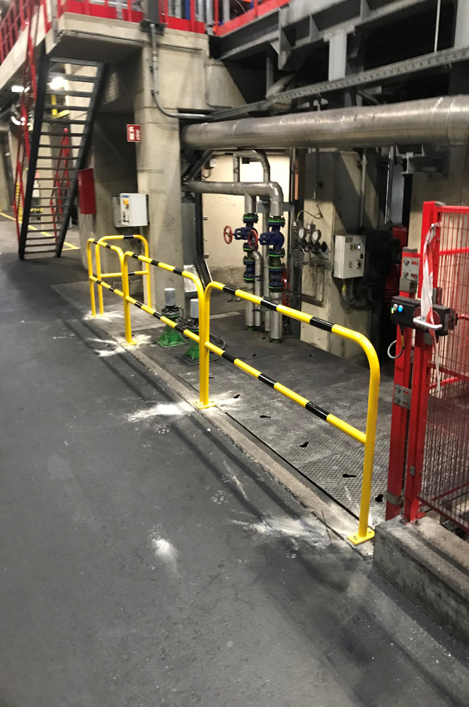 Immer wieder werden von den Lehrlingen im Betrieb kleinere Arbeiten, die Arbeitssicherheit verbessern, übernommen. Bei einer Sicherheitsbegehung am 19.07.2022 wurde im Bereich Garrett-Lift der unzureichende Schutz der Motoren/Pumpen direkt neben dem Fahrbahnbereich bemängelt - unter Umständen wäre man mit Sturzgefahr bzw. hohem Sachschaden durch Staplerverkehr konfrontiert.