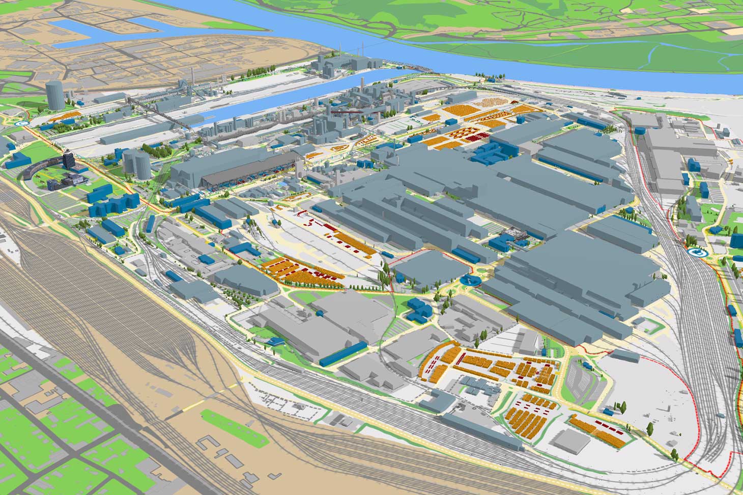 Allein 130 km Schienennetz, 500 km Rohrleitungen und 226 km Kanäle befinden sich auf dem Werksgelände. Dazu Gebäude und unzählige andere Objekte. Der Daten-Zwilling im Intranet gibt sie zentimetergenau wieder und wird daher schlicht Geoinformationssystem (GIS) genannt – eine gewaltige Untertreibung! Denn GIS bietet weit mehr als die Position von Hallen, Trassen und Anlagen.