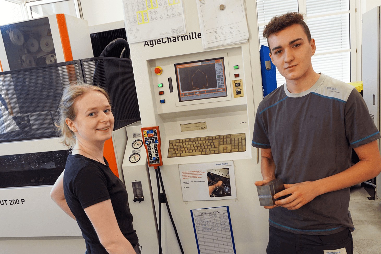 Elias H. ist einer der Auszubildenden der voestalpine Precision Strip. Vor zwei Jahren kam er schnuppern – und blieb, weil es ihm gefiel. „Die Vielseitigkeit der Ausbildung, die Nähe zur Praxis, und dann arbeitest du an mehreren Maschinen gleichzeitig, das ist cool!“, findet der angehende Werkzeugbautechniker. Beeindruckt berichtet er beispielsweise von den „voll coolen“ Erodiermaschinen, die aufs Tausendstel genau arbeiten, damit z. B. Passungen wirklich passen.