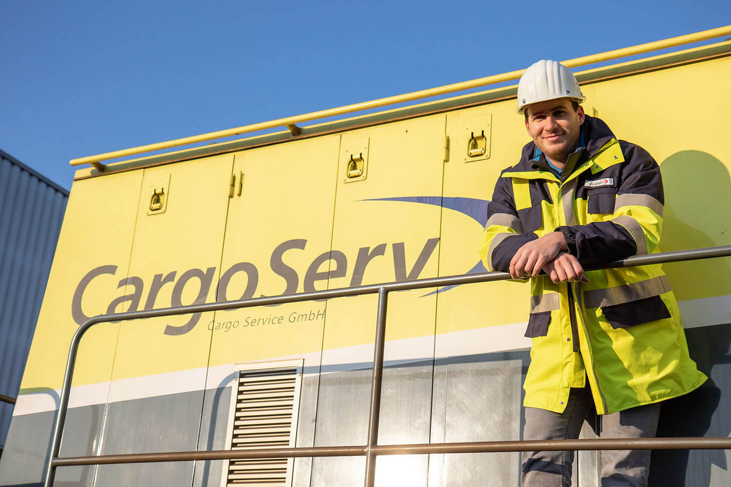 Benjamin von hinten mit der Werksbahn Weste mit der Aufschrift Gemeinsam auf Schiene vor einer Lok