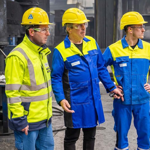 Nach seiner Lehre war Thomas von 1994 bis 2018 in der Hammerschmiede tätig, arbeitet sich vom Helfer bis zum Partieführer hoch. Als er 1996 mit 19 Jahren einen schweren Arbeitsunfall hat, ändert sich sein Leben schlagartig. Er musste alles neu lernen, verbrachte neun Monate in Rehabilitation. „Das war für mich ein Weckruf und hat mich schließlich auch dazu ermutigt, mich verstärkt für Arbeitssicherheit einzusetzen“, so Thomas, der nun seit 2018 als Sicherheitsfachkraft engagiert ist. „Nach der langen Reha wieder zurück in der Werkshalle zu sein, war damals sehr bewegend. Genau wie der Tag, an dem mein Sohn Sebastian zum ersten Mal hier im Betrieb war,“ erinnert er sich. „Oh ja, diesen Tag werde ich auch nie vergessen“, hakt Sebastian schmunzelnd ein. „Mit 14 Jahren direkt nach der Schule zum Schnuppern bei Papa in der Schmiede – das war wirklich eine komplett neue Welt. Ich kann mich heute noch daran erinnern, dass ich mit riesig großen Augen in die beeindruckende Halle gegangen bin.“