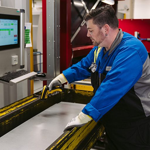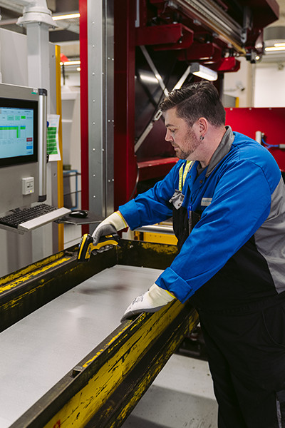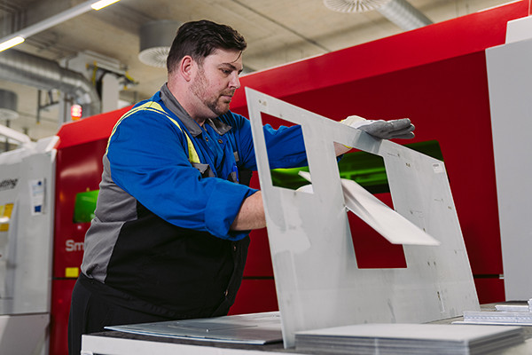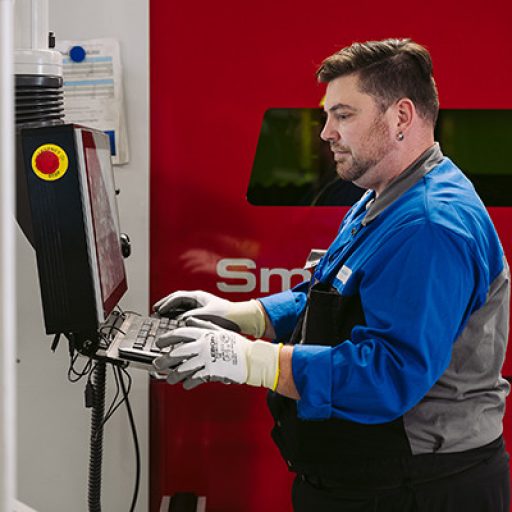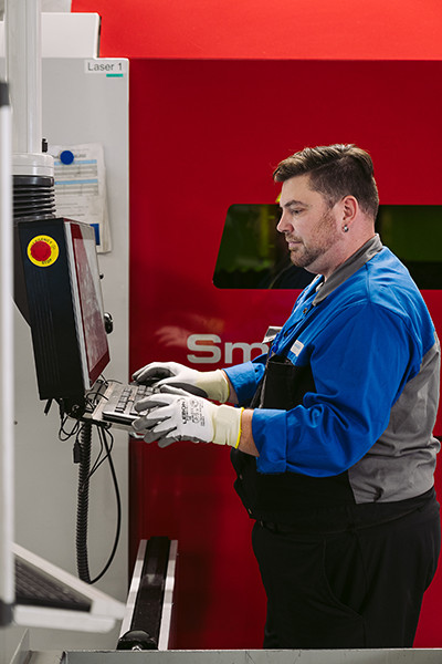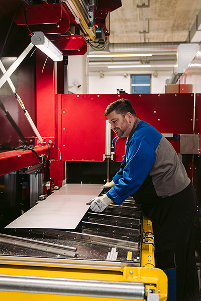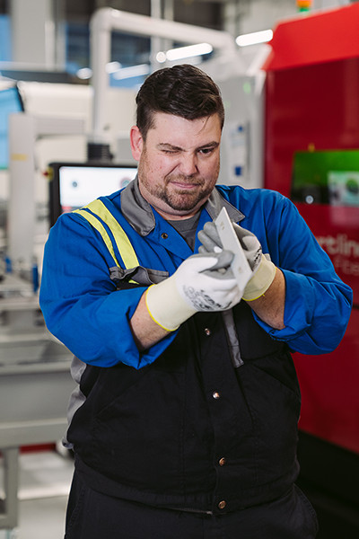 In der für ihn perfekten Fünferschicht startet er zweimal um halb sechs, zweimal um halb zwei und zweimal um halb zehn seinen Dienst in einem Fünferteam. Er bereitet die Probenstücke an der Vermessungs- und Markierstation beziehungsweise an der Laserschneidanlage für die Prüfung vor. Dabei scannt er die aufgebrachten Bar- oder QR-Codes der Bleche und das System weiß dann, an welchen Positionen die Probenstücke zur Zug-, chemischen oder Biegeprobe entnommen werden sollen. Die Informationen zur jeweiligen Probe werden an der Markierstation direkt auf die späteren Probenstücke gelasert, den Rest erledigt der Laserschneider.