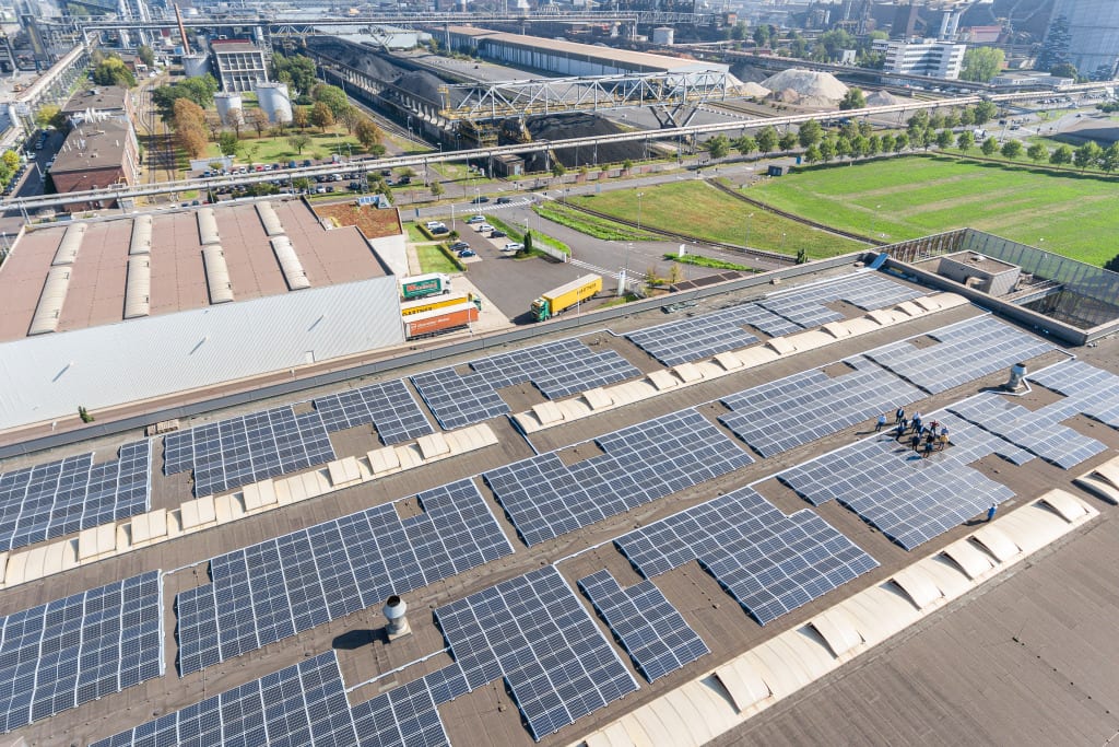 Luftaufnahme der Photovoltaik Anlage in der voestalpine Linz von weit oben