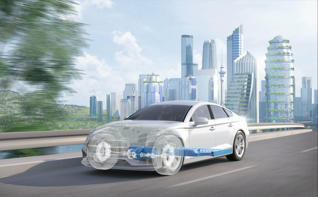 Illustration of a semi-transparent e-car driving on a road in front of a futuristic skyline