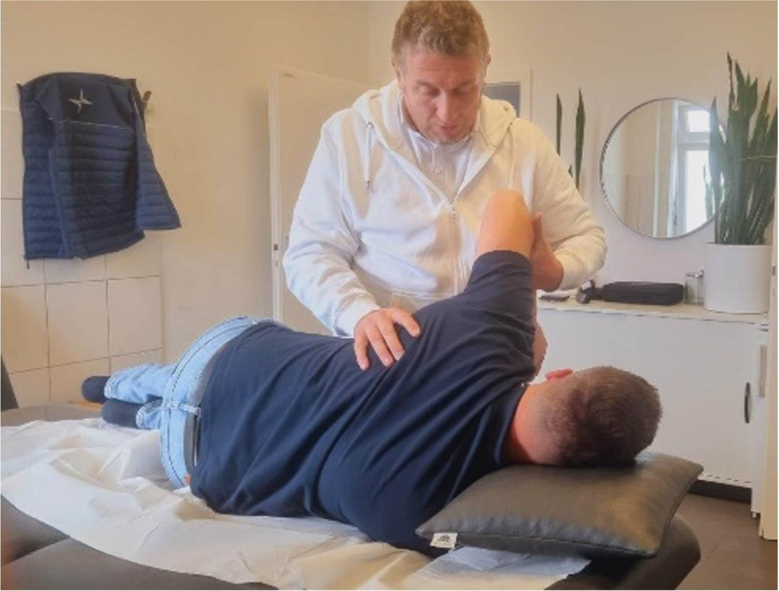 The physiotherapist treats the patient on the couch.