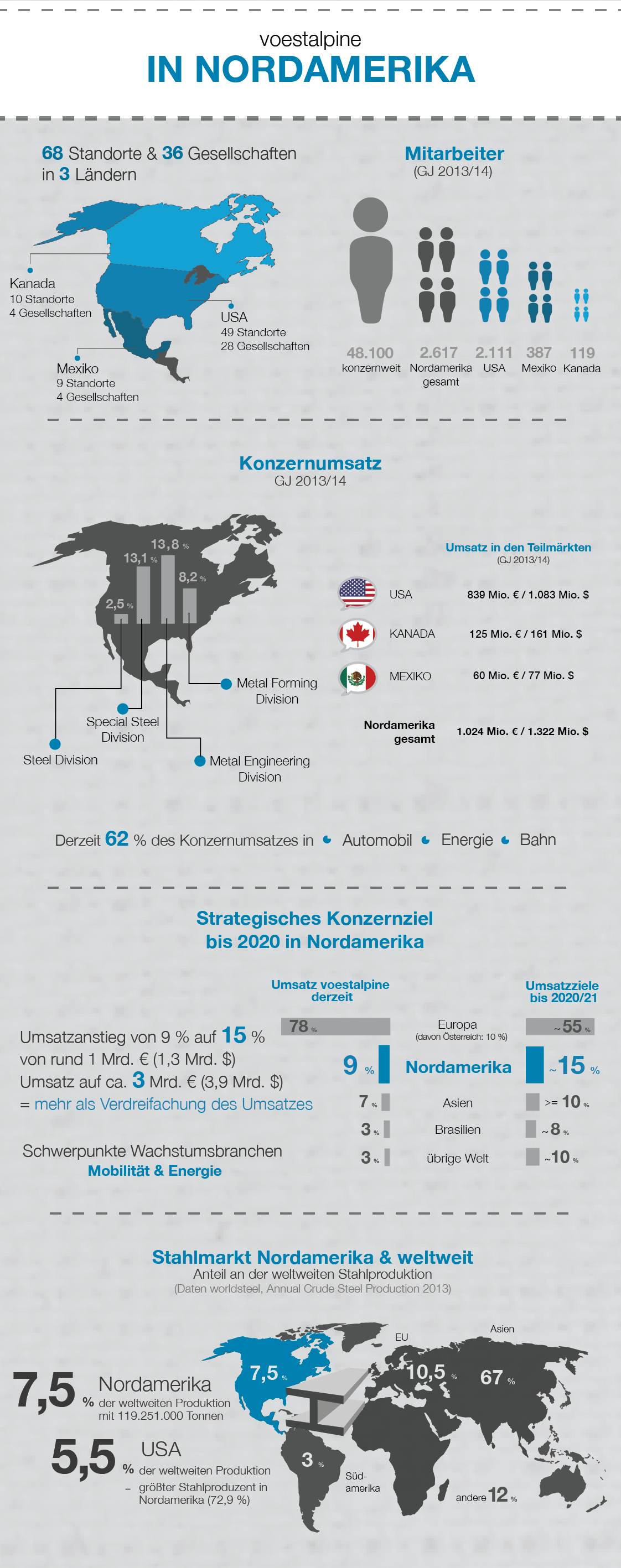 Im Geschäftsjahr 2012/13 erwirtschaftete der voestalpine-Konzern bereits 8 Prozent seines Gesamtumsatzes von 11,5 Mrd. EUR (15,8 Mrd. USD) an seinen 68 Standorten mit rund 2.500 Mitarbeitern in Nordamerika – dies entspricht rund 1 Milliarde EUR (1,3 Mrd. USD). Alleine in den USA wurde mit 2.000 Mitarbeitern ein Umsatz von 840 Mio. EUR (1,1 Mrd. USD) erwirtschaftet. Die größte Einzelgesellschaft ist voestalpine Nortrak, die mit rund 1.000 Mitarbeitern sowie sieben Produktions- und Vertriebsstandorten im Bereich der Eisenbahn-Weichentechnik Markt- und Technologieführer in Nordamerika ist. Stark vertreten ist der Konzern zudem in den Bereichen Automotive, Edelstahl, Energie und Luftfahrt. Aktuell eröffnete die Metal Forming Division ein Werk für höchstfeste Karosserieteile in Cartersville/Georgia mit einem Investitionsaufwand von 50 Mio. EUR (69 Mio. USD). Als Teil einer umfassenden längerfristigen Globalisierungsstrategie wird der voestalpine-Konzern seine bereits starke lokale Präsenz im Wachstumsmarkt USA in den nächsten Jahren forciert weiter ausbauen. Im Übrigen stehen rund 10 % der voestalpine-Aktien im Eigentum nordamerikanischer Investoren.