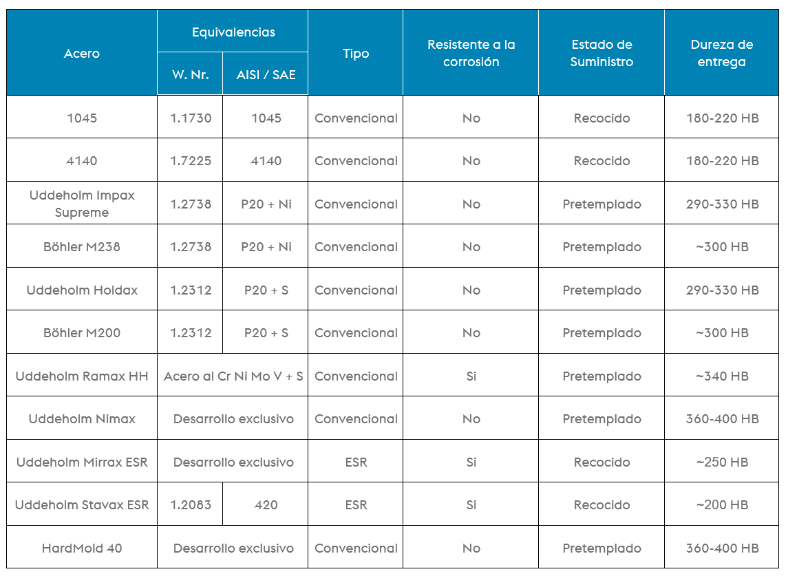 Estos aceros se suministran templados y revenidos, normalmente en la banda de 270 – 400 HB. No es necesario realizar ningún tratamiento térmico antes de comenzar a utilizar el molde. En la mayoría de los casos, la dureza puede incrementarse. El acero pretemplado para portamoldes se utiliza generalmente en moldes de gran tamaño y moldes con series de producción moderada.