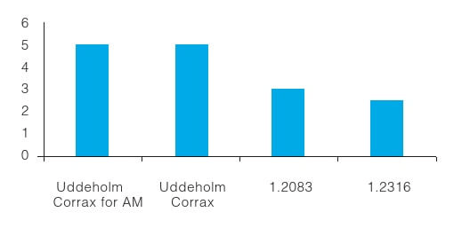 Uddeholm, una de las acerías más importantes de voestalpine, ha desarrollado el polvo AM CORRAX basado en su tradicional acero para moldes de plástico del mismo nombre que posee las siguientes características: