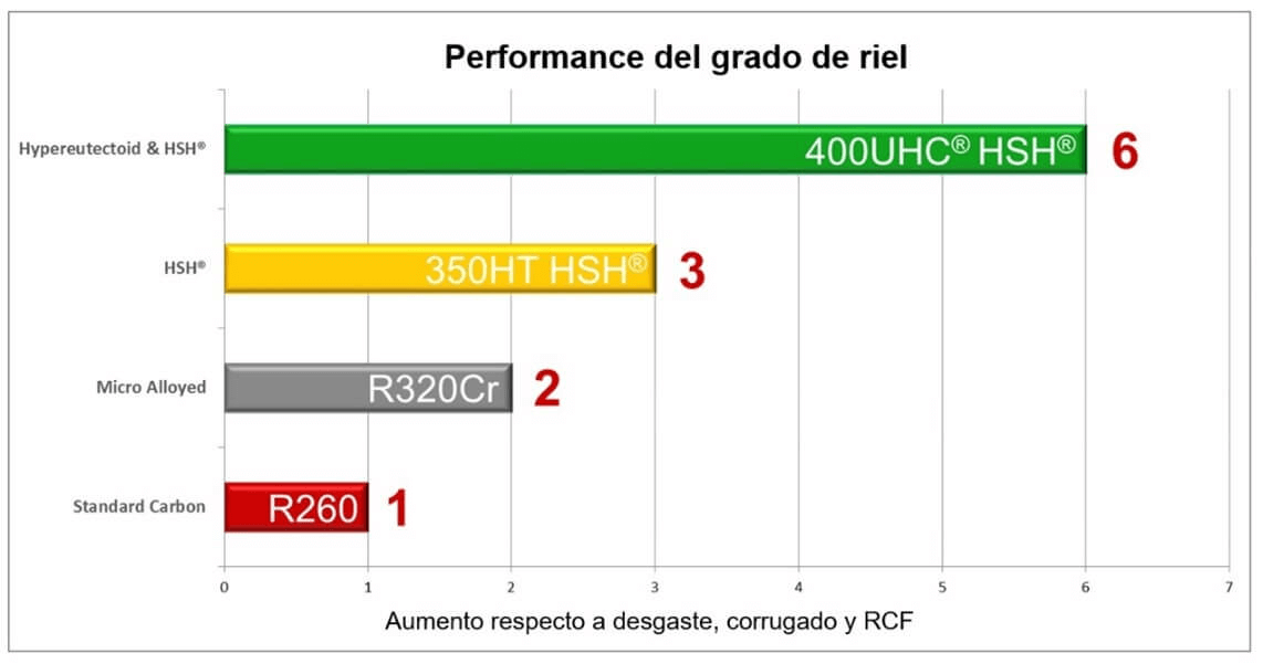 La solución clásica de “vanguardia” para el transporte de cargas por ferrocarril o entornos de transporte pesado, exhibe una microestructura ultra fina perlítica tratada térmicamente. Esto ya está dando servicio en vías desde hace más de 20 años con el máximo beneficio para el cliente.