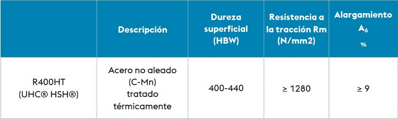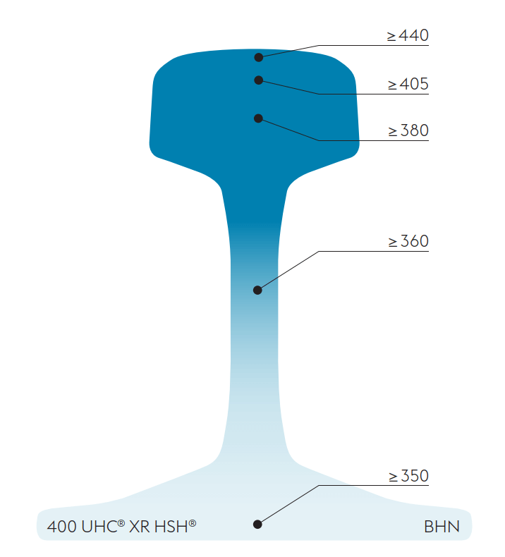 El acero para riel 400 UHC® HSH® de voestalpine es una estructura de grano fina, perlítica, tratada térmicamente de acuerdo con la norma EN 13674-1, con una dureza mínima de 400 BHN. voestalpine Rail Technology fabrica este hiper-grado de acero eutectoide a través de su patente mundial HSH® bajo la marca 400 UHC®HSH®. El riel calidad 400 UHC® HSH® está disponible en todos los perfiles habituales ferroviarios y en longitudes sin soldar de hasta 120 metros.