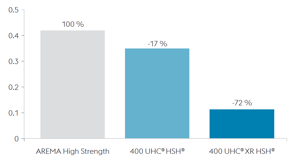 Esto se traduce en hasta un 100 % más de vida útil en comparación con 370 BHN (AREMA High Strength) y una ampliación de los ciclos de esmerilado de hasta 3 veces.