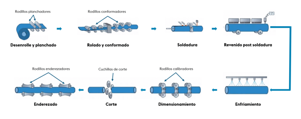 La fabricación en frío de tubos a través de rodillos es un proceso industrial que permite, partiendo de una chapa de acero plana o bobina, ir curvando la misma hasta llegar a la forma deseada. Se utiliza un alimentador de bobinas, rodillos niveladores, rodillos conformadores, rodillos para soldadura, rodillos calibradores, cuchillas de corte y por último, rodillos enderezadores. El alimentador de chapas suministra el material, que suele ser en bobinas y luego, la lámina de acero va pasando por los distintos pasos que van moldeando, soldando y enderezando el tubo poco a poco para evitar tensiones y deformaciones.