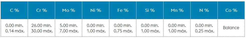Nuestra aleación es no magnética a base de cobalto, cromo y molibdeno, y tiene una alta resistencia mecánica, así como una alta resistencia a la corrosión y a la fatiga. La utilización más común de esta aleación es para la producción de piezas mecanizadas o forjadas para la industria ortopédica para la cirugía de reemplazo completo de las articulaciones, pero también para la fabricación de prótesis dentales a medida