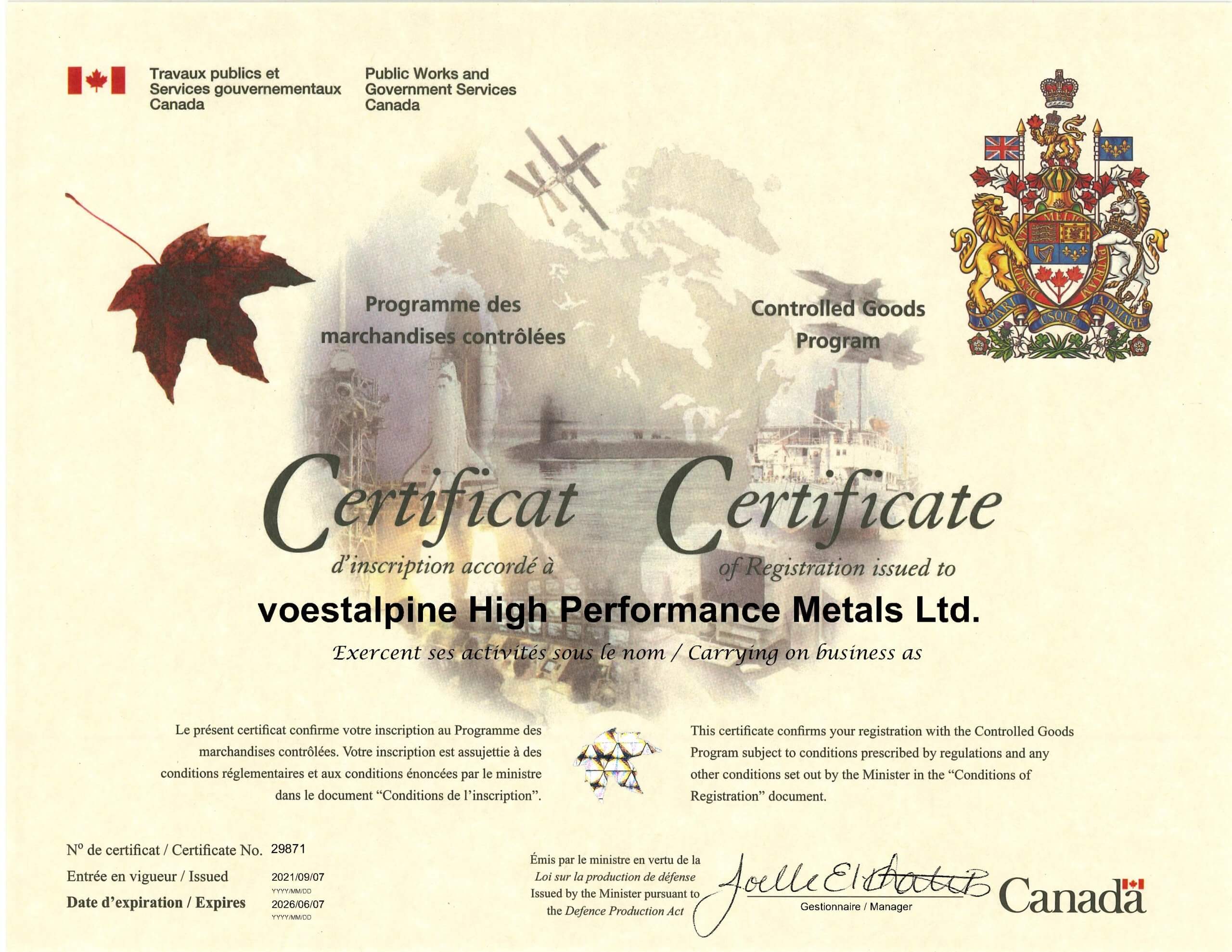U.S. companies must be properly registered with the DDTC for the exemption to apply. voestalpine High Performance Metals, Ltd. (hereinafter “vHPML”) and voestalpine Additive Manufacturing Centre Ltd. (hereinafter ¨vAMCCA¨) are registered with the CGD and are therefore eligible to receive technical data on various defense articles as permitted under the ITAR Canadian Exemption. vHPML’s and vAMCCA´s CGD registration numbers are 29871 and 29898. vHPML’s and vAMCCA´s registration status can also be confirmed through a search of the CGD registration database, available at https://www.tpsgc-pwgsc.gc.ca/pmc-cgp/recherche-search-eng.html, and by telephoning the CGD information desk at 1-866-368-4646 or via e-mail at ncr.cgd@pwgsc.gc.ca.