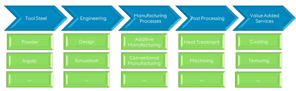 Die voestalpine-Wertschöpfungskette für Kunststoffspritzguss umfasst folgende Schritte (Auszug aus dem Portfolio):