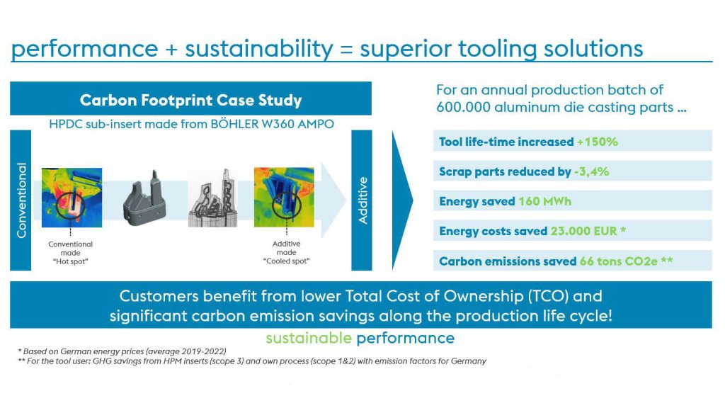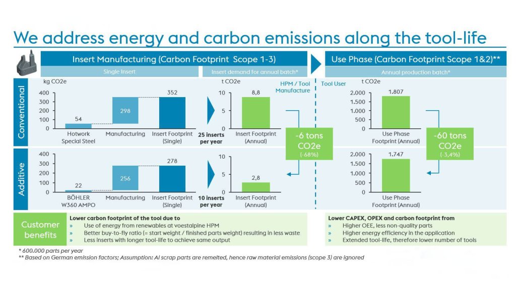 Wie die obige Abbildung zeigt, produziert der voestalpine AM Sub Insert weniger CO2 bei der Herstellung und weniger CO2 in der Nutzungsphase. Wichtige Punkte: