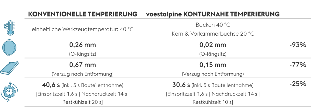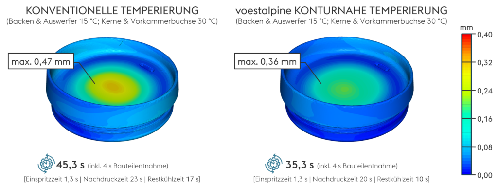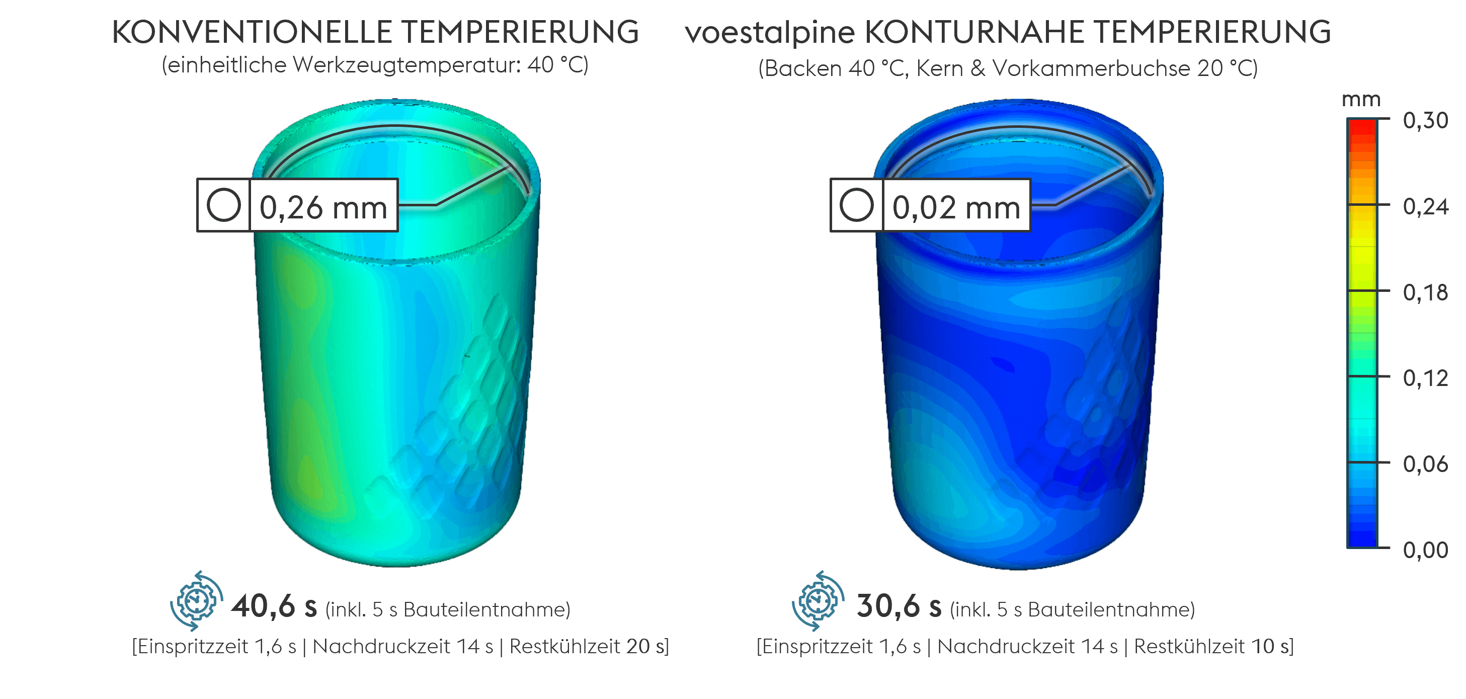 Das entscheidende Qualitätsmerkmal des Formteils ist die Rundheit und der Durchmesser des O-Ring-Sitzes. Die Abbildung zeigt, dass sich der Verzug durch konturnahe Kühlung trotz der um 10 s verkürzten Kühlzeit um ca. 0,24 mm reduziert. Ebenso wichtig ist, dass die geforderte Toleranz weiterhin eingehalten wird. Die deutliche Reduzierung des Verzugs ist auf die sehr homogene Werkzeugwandtemperatur der Schieberbacken zurückzuführen (ΔT < 2 K).