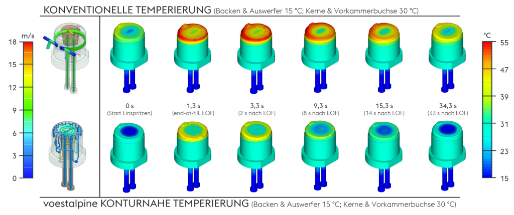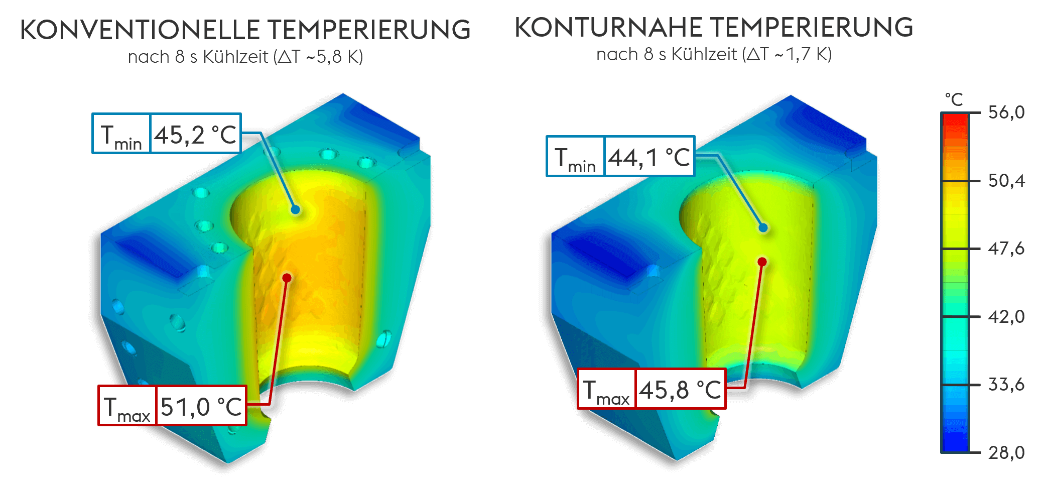 Ein Vergleich zwischen der konventionellen und der konturnahen Temperierung verdeutlicht die Vorteile der konturnahen Variante. Bei der konturnahen Kühlung folgen die Kanäle exakt der Form des Bauteils, sodass die Strukturen in den Rauten während des Kühlvorgangs exakt nachgebildet werden können. Dies ist besonders im kritischen Kernbereich von Vorteil, wo die Wärmeableitung während des gesamten Zyklus eine wichtige Rolle spielt. Hierdurch wird eine wesentlich effizientere Kühlung ermöglicht.