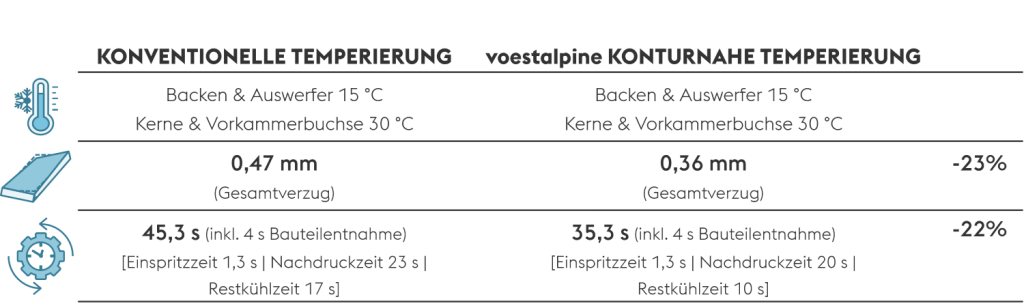 Neben diesen Qualitätsverbesserungen konnte mit der konturnahen im Vergleich zur konventionellen Kühlung zusammen eine signifikante Reduzierung der Zykluszeit um 10 Sekunden erreicht werden. Darüber hinaus spielt der Wärmeeintrag aus dem Heißkanal eine entscheidende Rolle bei der Einhaltung der geforderten Ebenheit im Deckelboden. Eine effektivere Kühlung im Kern- und Auswerferbereich erhöht die Ebenheit weiter.