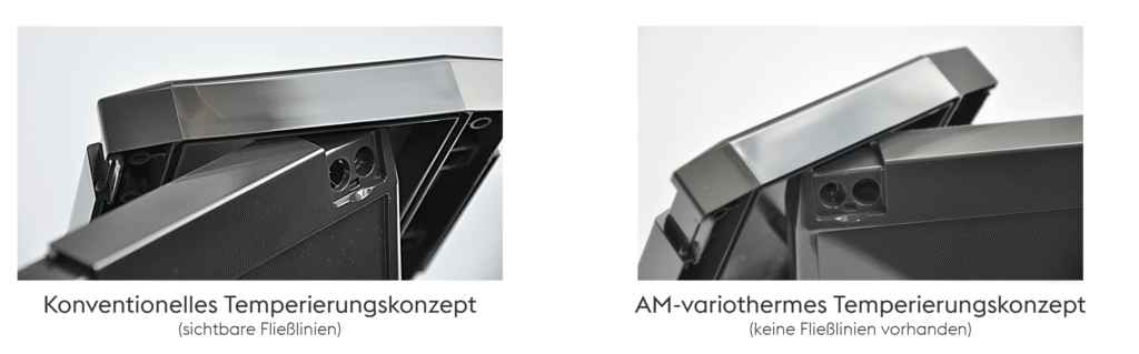 Die Abmusterung des Formeinsatzes erfolgte durch den Kooperationspartner FBB Formenbau Buchen GmbH. Hierbei wurde sowohl den konventionell gebohrte Einsatz mit kontinuierlicher Wassertemperierung (90 °C) als auch der additiv gefertigte Einsatz mit konturnaher, variothermer Temperierung (70/140 °C) bemustert. Durch die erhöhte Fließfronttemperatur im variothermen Prozess konnten die Fließlinien vollständig eliminiert werden.