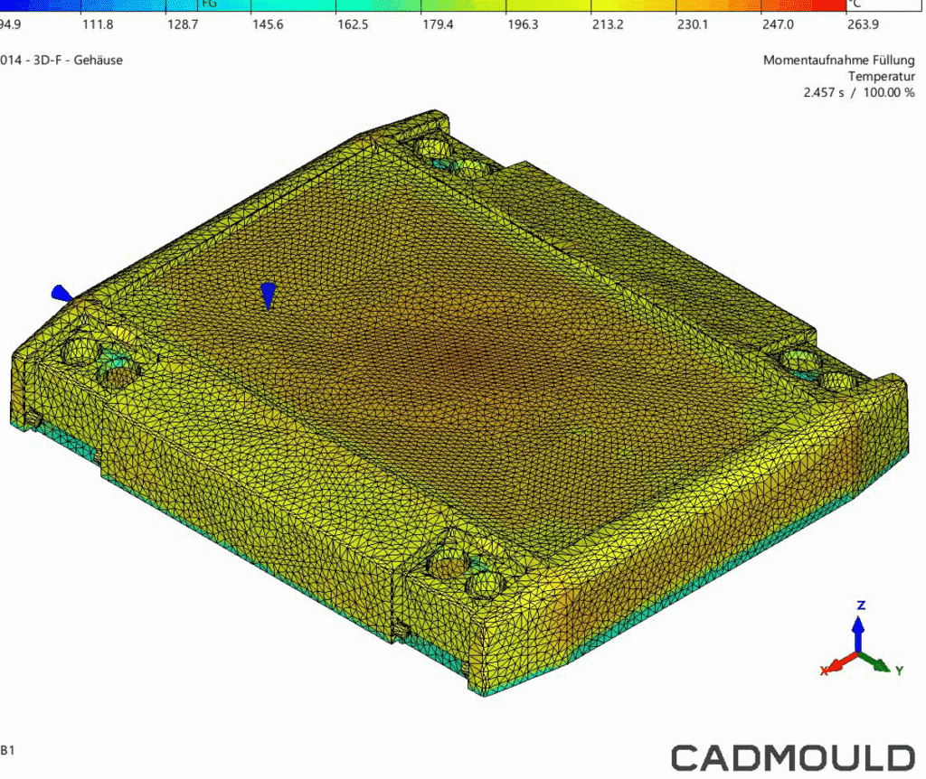 Neben der grundlegenden technischen Funktion eines Kunststoffformteils spielen heutzutage insbesondere ästhetische Aspekte eine entscheidende Rolle bei der Kaufentscheidung. Bei Gehäusebauteilen – wie diesem Demonstrator – kann ein nicht optimiertes Thermomanagement des Formeinsatzes nicht nur zu Maßabweichungen führen, sondern auch zu sichtbaren Bindenähten und Fließlinien im Bereich von Funktionselementen und Durchbrüchen. Dies hat oft höhere Ausschussraten zur Folge sowie längere Zykluszeiten aufgrund von prozessbedingten Korrekturmaßnahmen.