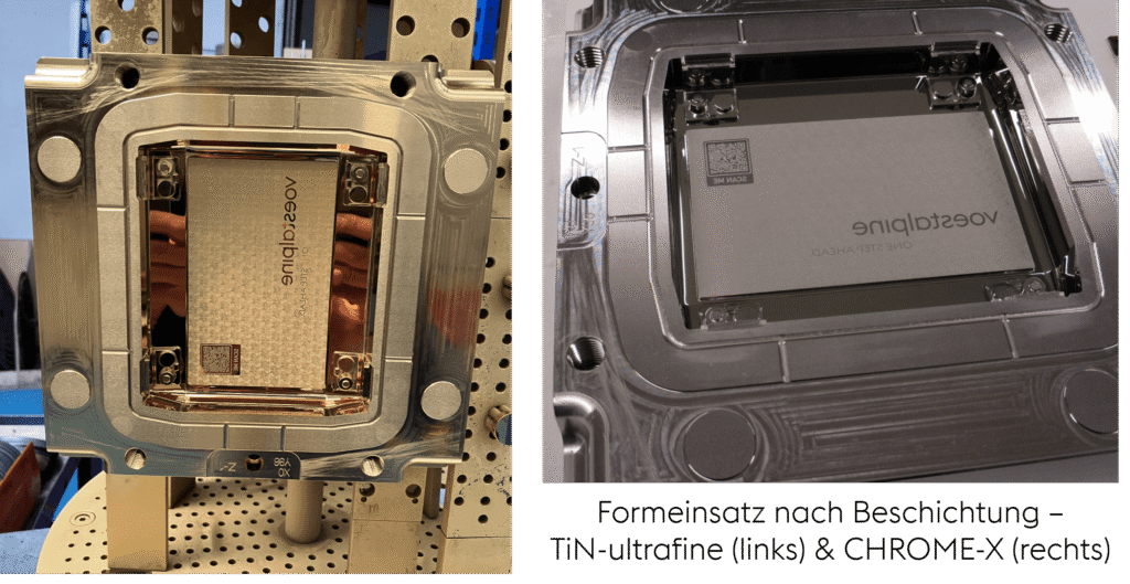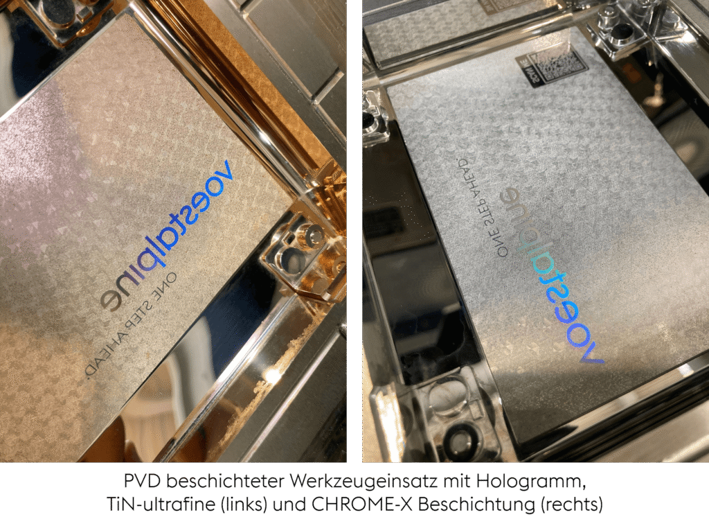 Die beim Gehäuse verwendete flammgeschützte PC/ABS-Formmasse macht einen Verschleißschutz der feinen Hologramm-Textur notwendig, um den Effekt über die Werkzeugstandzeit zu erhalten. Die geforderte Verschleißbeständigkeit der Oberflächen bei gleichzeitigem Erhalt der Hochglanzoberfläche wird mit der TiN-ultrafine– oder der CHROME-X-Beschichtung der voestalpine eifeler Coating erreicht. Neben dem Verschleißschutz wird durch die Beschichtung auch die Entformung positiv beeinflusst. Die TiN-ultrafine ist eine verschleißfeste Arc-Schicht, welche mittels SPCS-Technologie hergestellt wird und dadurch Droplet-ärmer als herkömmliche Arc-TiN-Schichten ist. Im Gegensatz hierzu wird bei der CHROME-X die Sputter-Technology genutzt, wodurch ein Droplet-freier Schichtauftrag ermöglicht wird. Mittels TiN-ultrafine oder CHROME-X kann demnach der ideale Kompromiss zwischen Verschleißbeständigkeit und Glanzgraderhaltung getroffen werden.