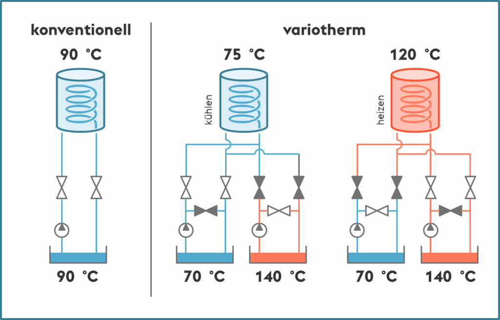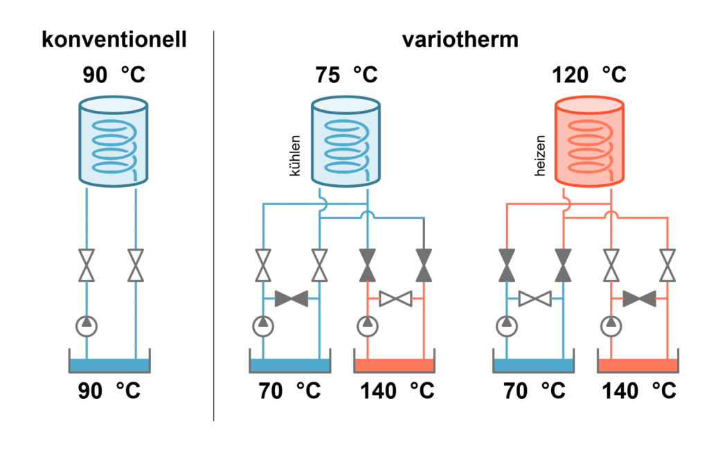 Die variotherme Temperierung von Spritzgießwerkzeugen verbessert die ästhetischen Eigenschaften von Spritzgießbauten im Vergleich zum herkömmliche Spritzgießen, indem die Werkzeugtemperatur anpasst. Im Gegensatz zu herkömmlichen Spritzgießverfahren, bei denen der geschmolzene Kunststoff unmittelbar eine gefrorene Randschicht beim Kontakt mit der Werkzeugwand bildet, wird beim variothermen Prozess die Temperatur der Werkzeugwand vor dem Einspritzen erhöht und erst nach dem Füllvorgang abgekühlt. Dadurch wird ein sofortiges Einfrieren der Randschicht verhindert, der Glanzgrad verbessert, Oberflächenstrukturen präziser abgeformt und die Viskosität bleibt während der gesamten Einspritzphase konstant. Für den wirtschaftlichen Einsatz der variothermen Temperierung muss das temperierte Werkzeugvolumen möglichst gering gehalten werden, um die effiziente und schnelle Wärmezufuhr und –abfuhr zu gewährleisten.