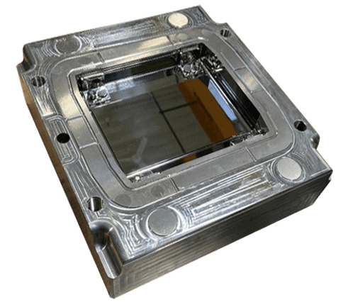 Die konturnahe Kühlungsauslegung im Demonstrator wurde zusätzlich für die variotherme Prozesskontrolle optimiert. Durch Vergrößerung der Heizfläche und Minimierung des Abstands zwischen den Kühlkanälen und der Werkzeugwand konnte eine extrem schnelle Erwärmung der Werkzeugwand ermöglicht werden. Dies eliminiert sichtbare Fließlinien auf der Oberfläche des Bauteils und ermöglicht die Abbildung feine Oberflächenstrukturen wie beispielweise die hier gezeigten Hologramme. Während der Halte- und Kühlphase ermöglichte das konturnahe Layout eine schnellere Abkühlung des Bauteils im Vergleich zur konventionellen Struktur. So konnte bei verkürzter Zykluszeit ein fehlerfreies Bauteil produziert werden.