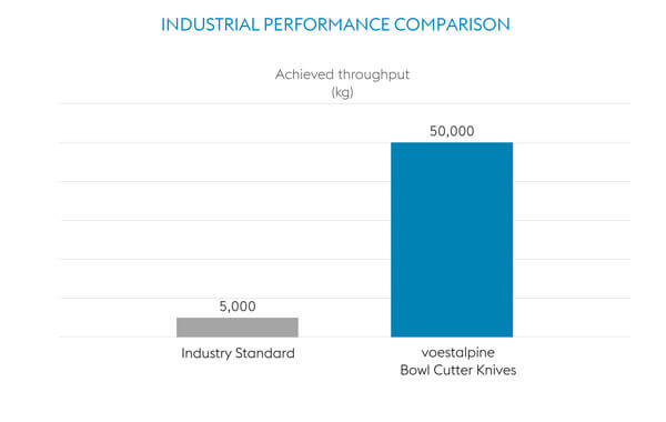voestalpine Bowl Cutter Knives offer far superior performance. Through their premium materials, they offer an outstanding balance of high wear resistance, ductility (safety against cracks and breaks), and corrosion resistance. As shown in the figure below, they allow, for example, up to ten times more throughput on a boiled sausage production before regrinding is needed. Depending on the application these figures can go even higher. This allows for higher productivity and lower total cost of ownership.