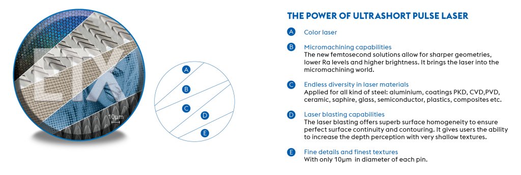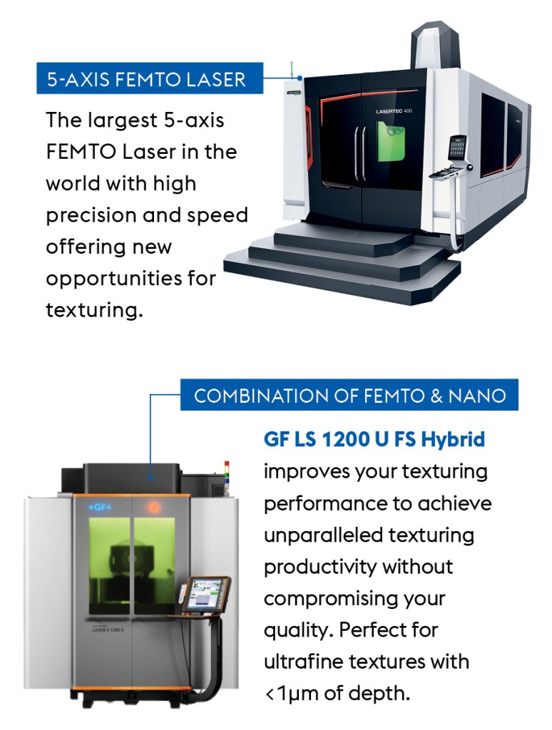 The innovative 5-axis LASERtex uses laser ablation where a laser beam removes layer by layer from the tool surface of a plastic injection die. This produces multi-layered surface laser texture, ranging from complex architectural or geometric patterns to textile, natural patterns and fine textures. This method is also suitable for manufacturing functional surfaces such as for light reflection, friction, aerodynamics, etc.
