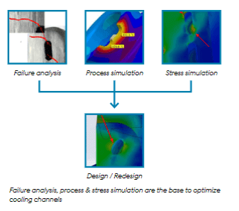 If needed, our experts can help our customers redesign tools to meet the exact requirements of their application. Our data-driven approach to cooling channel design analyzes processing parameters and mechanical loads to develop detailed computer models and process simulations. This method of optimizing thermal management is essential to ensure the right balance between efficient cooling and the mechanical performance of the mold. This process goes far beyond regular near-contour cooling channel design. We understand your application.