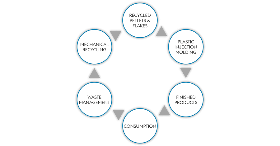 Il diagramma seguente illustra l’economia circolare per il riciclaggio meccanico delle materie plastiche: