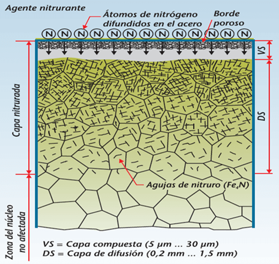 Tratamiento termoquímico que implica el enriquecimiento de la superficie (absorción y difusión) solo con N (nitruración) o predominantemente N y C (nitrocarburación) para impartir resistencia al desgaste y a la corrosión, resistencia superficial y resistencia a la fatiga.