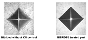Las imágenes de las dos hendiduras del ensayo de dureza Vickers que se muestran a continuación ilustran la diferencia entre un proceso controlado y otro no controlado. La muestra de la izquierda está producida mediante un proceso tradicional y el agrietamiento superficial es indicativo de la fragilidad de la capa. La muestra de la derecha es producto de un proceso Nitreg® en el que, a pesar de que la pieza tiene la misma dureza, no se han formado grietas. Por lo tanto, el componente tratado con Nitreg® es más resistente y tiene una capa de compuesto muy dura. La capacidad de controlar el potencial de nitruración se está convirtiendo gradualmente en un requisito, tal y como se observa en la norma AMS 2759/10, por ejemplo.