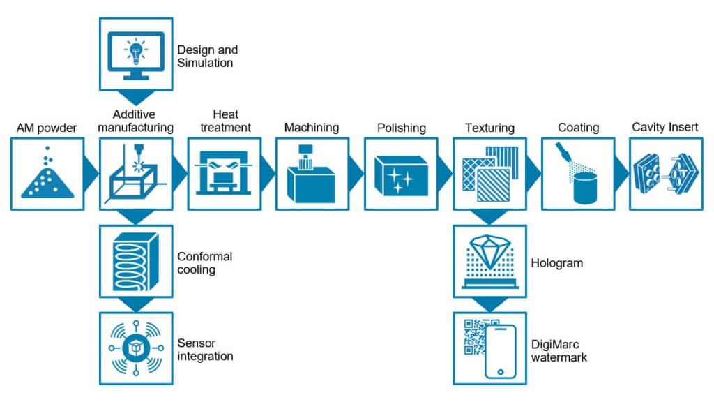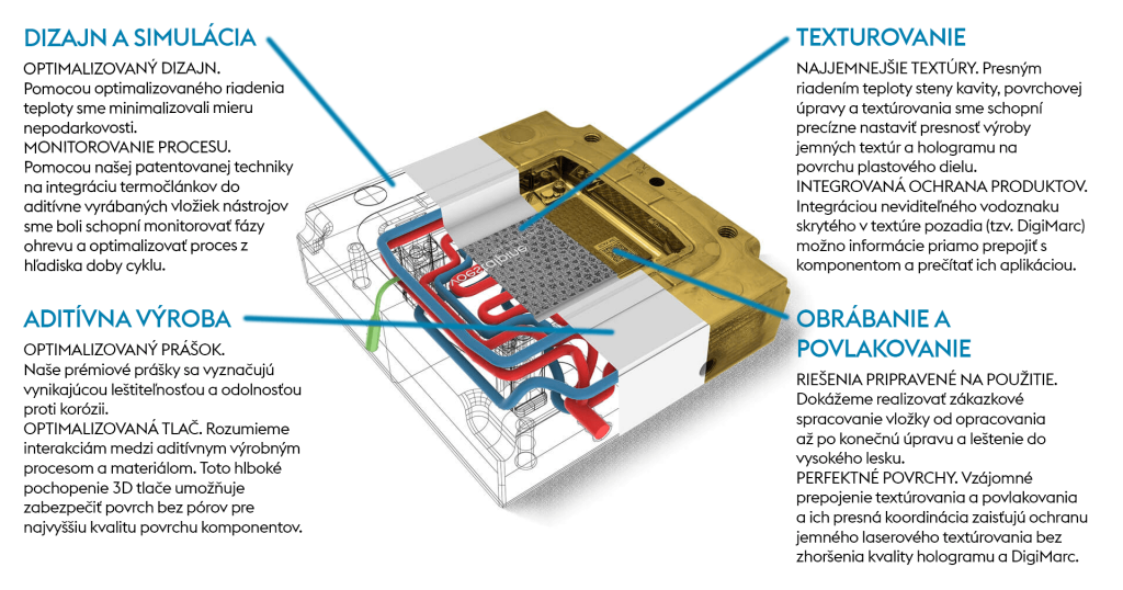 Ako ste sa dozvedeli v tomto článku, voestalpine vložka pre formy na vstrekovanie plastov je ukážkou kompletného riešenia v rámci jedného hodnotového reťazca – od konceptu až po hotový výrobok. Naše riešenie umožňuje nielen vylepšenia procesu vstrekovania prostredníctvom funkcií, ako je konformná konštrukcia AM chladenia a variotermická regulácia teploty, ale umožňuje aj pridať hodnotu výrobkom použitím technológií, ako je textúrovanie a PVD povlak (DigiMarc a hologramový efekt).