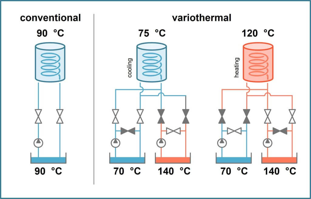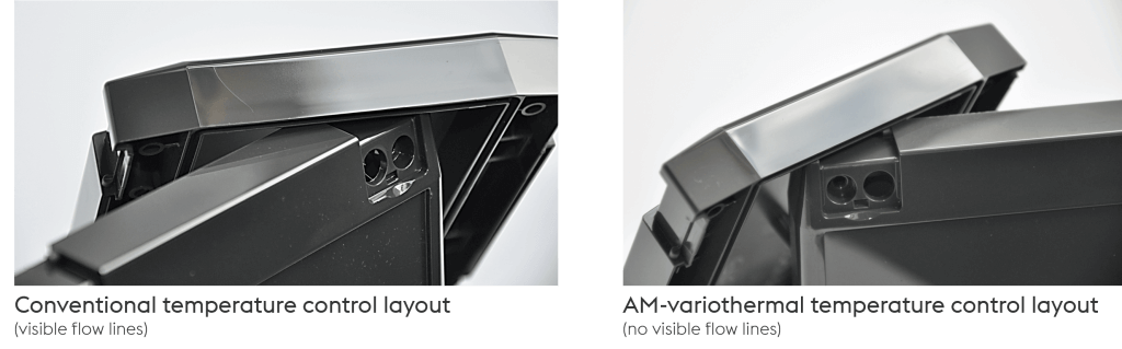 Konformná konfigurácia chladiaceho kanála vo vložke dutiny umožňuje variotermickú reguláciu teploty (70/140 °C). Zvýšená teplota na čele toku pri variotermickom procese eliminuje prietokové línie.