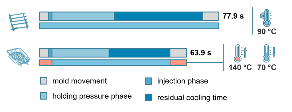 Napriek variotermickej regulácii procesu sa čas cyklu môže skrátiť o 18 % v porovnaní s konvenčným procesom (konvenčne vyrobená vložka).