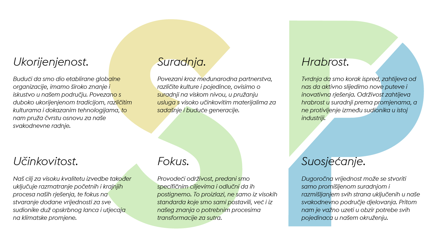 Unutar našeg inSPire okvira održivosti, živimo i djelujemo u skladu sa vrijednostima koje nas oblikuju i vode u našim svakodnevnim radnjama i operacijama