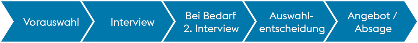 Sollte die Entscheidung nicht auf Sie fallen, werden Sie verlässlich und zum ehestmöglichen Zeitpunkt informiert. Da oftmals nur kleine Details entscheiden, freuen wir uns über eine erneute Bewerbung für künftige freie Stellen.