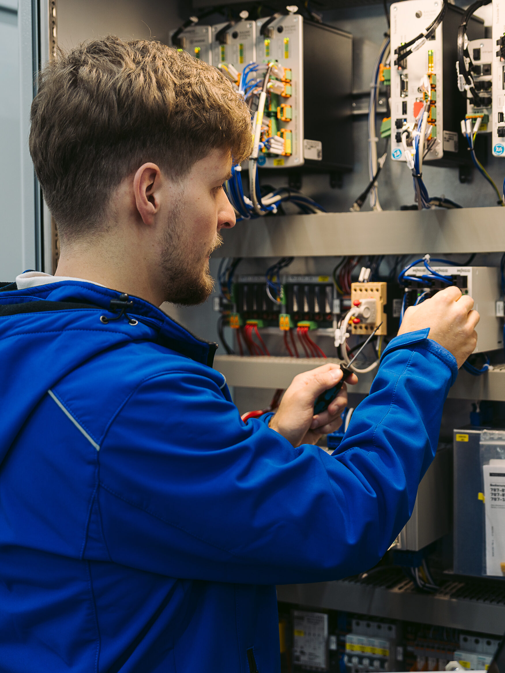 Nach der Produktion geht es weiter ins Prüffeld, den letzten Schritt vor der Auslieferung. Hier werden die zuvor gebauten Sensoren und Komponenten zu einem vollständigen System im Schaltschrank zusammengesetzt. Dabei entsteht ein gutes Verständnis dafür, wie alles im Gesamten zusammenhängt und funktioniert.