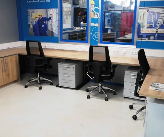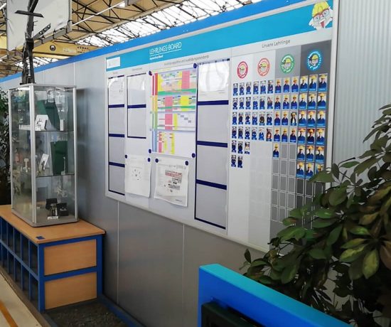 Als nach sechs Jahren Future Zone und mit mittlerweile 62 Lehrlingen der Platz im Umkleide- und Spind-Bereich knapp wurde, eröffnete sich ein spannendes Projekt. Sieben Lehrlinge aus den Bereichen Maschinenbautechnik, Schweißtechnik, Zerspanungstechnik und Elektrotechnik machten gemeinsam mit ihren Ausbilder:innen innerhalb von zwei Wochen ihre Future Zone wieder future-proof: Im ehemaligen Büro wurde zusätzlicher Platz für Spinde geschaffen, das Büro wanderte in die einstigen Räumlichkeiten der Programmierarbeitsplätze. Statt teure Bürocontainer zuzukaufen, fanden die Programmierarbeitsplätze ihr neues Zuhause in einer selbst gebauten Hütte aus Sandwichpaneelen. Die Lehrlinge gestalteten außerdem dem Eingangsbereich komplett um. Herzstück ist das neue Tor im Schienenverkehrs-Look, das von den Lehrlingen eigenständig entworfen und aus ausgedienten aufbereiteten Oberbauleitungen gefertigt wurde. Auch die Büroeinrichtung inklusive aufgewerteter und angepasster alter Schreibtische sowie die Stromanschlüsse stammen aus den Händen der Lehrlinge. So finden jetzt sowohl die Lehrlinge im Umkleidebereich als auch die vier Ausbilder:innen in ihrem neuen Büro ausreichend Platz. Dass das Büro nun direkt vor Ort und nicht mehr in einem anderen Gebäude ist, ist ein weiterer Vorteil des Umbaus, den die Lehrlinge kürzlich erfolgreich abgeschlossen haben.