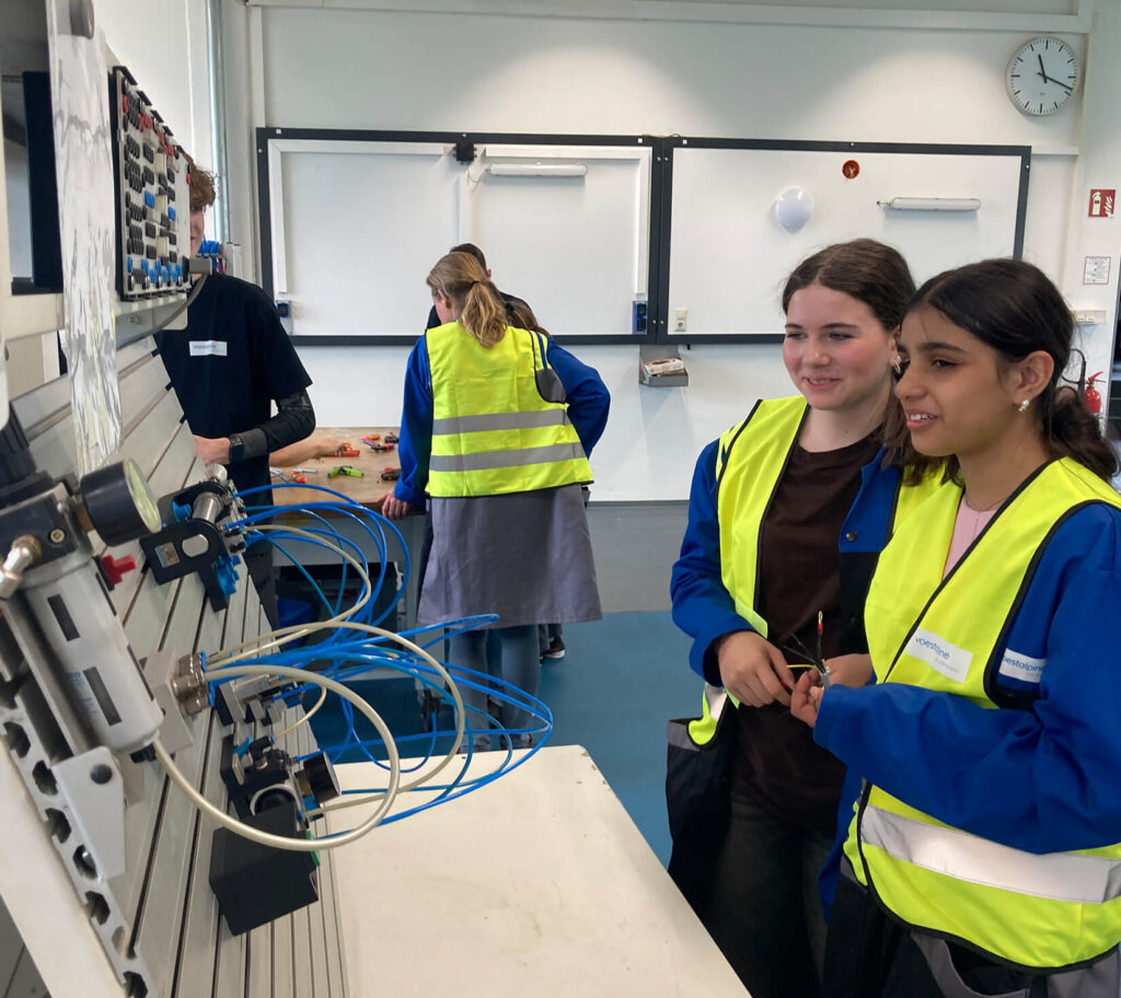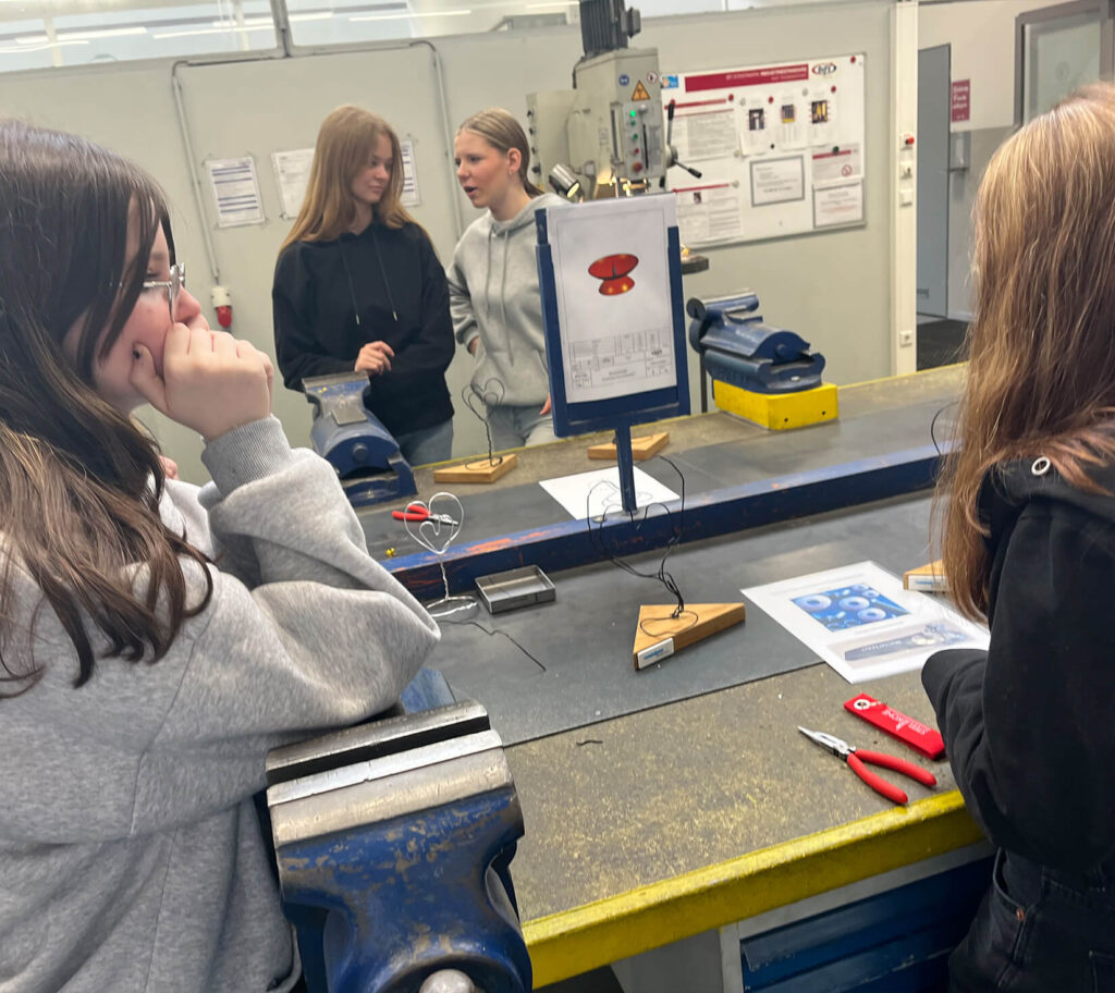 Nach einem Rundgang in der Lehrwerkstätte konnten sich die jungen Damen bei einzelnen Stationen ein genaueres Bild über die verschiedensten Berufe & Tätigkeiten machen und durften sich unter Anleitung durch unsere Lehrlinge, Tätigkeiten wie Feilen, Anreißen, Bohren, Fräsen, CNC, Pneumatik, Schweißen, Robotik und Elektrotechnik widmen. Im Zuge dieser Stationen fertigten sie schließlich ein eigenes Werkstück an. Eine anschließende Werksführung durfte auch nicht fehlen, um einen guten Einblick in die beiden Gesellschaften zu bieten.
