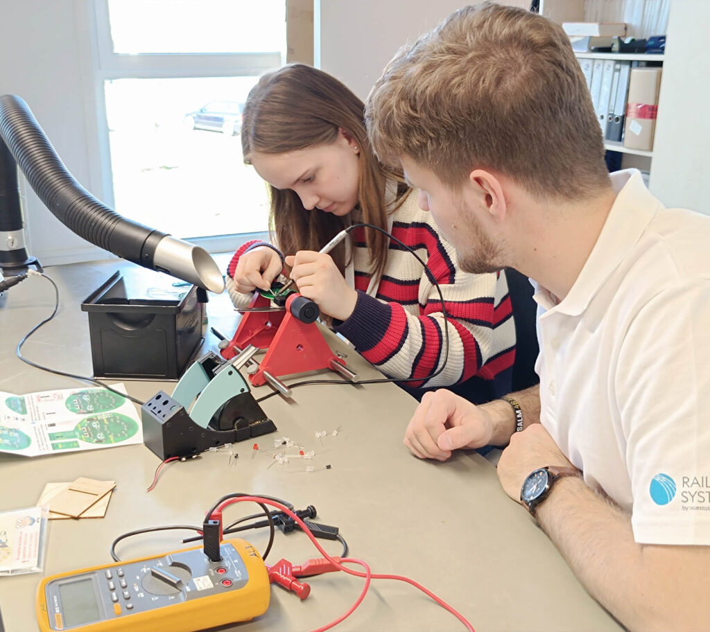 Nach einem kurzen „Meet & Greet“ mit den aktuellen Azubis, die einen Einblick in die verschiedenen Ausbildungsberufe gaben, konnten die Teilnehmerinnen ihr Können bei spannenden technischen Praxisstationen unter Beweis stellen. Der Bau eines Stimmungsbarometers in der Produktion erforderte viel Geschick: Leuchtdioden wurden in Form eines Gesichts eigenständig auf eine Platine gelötet. Durch die Unterstützung unserer Auszubildenden war das Stimmungsbarometer schnell einsatzbereit.