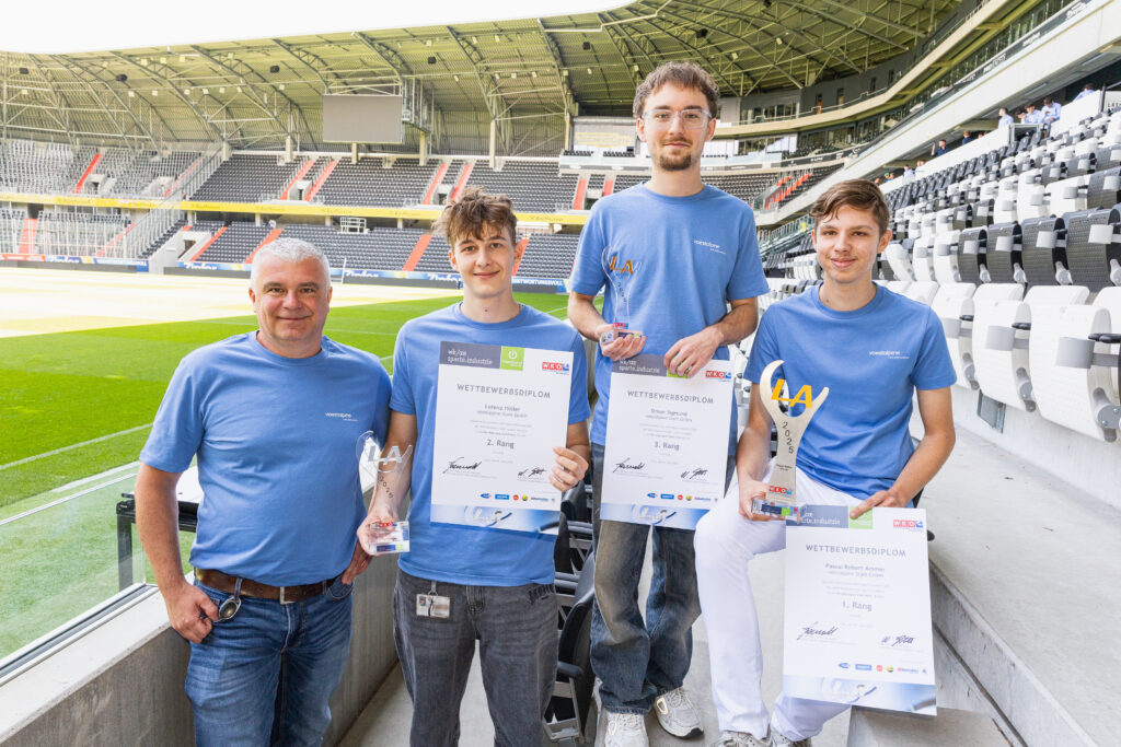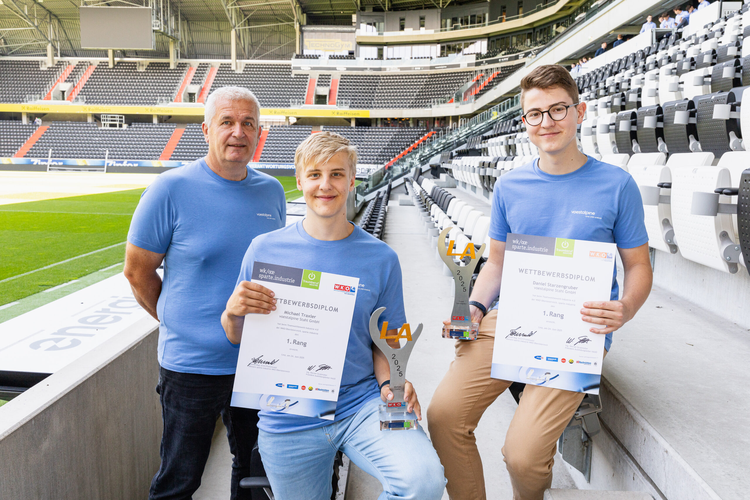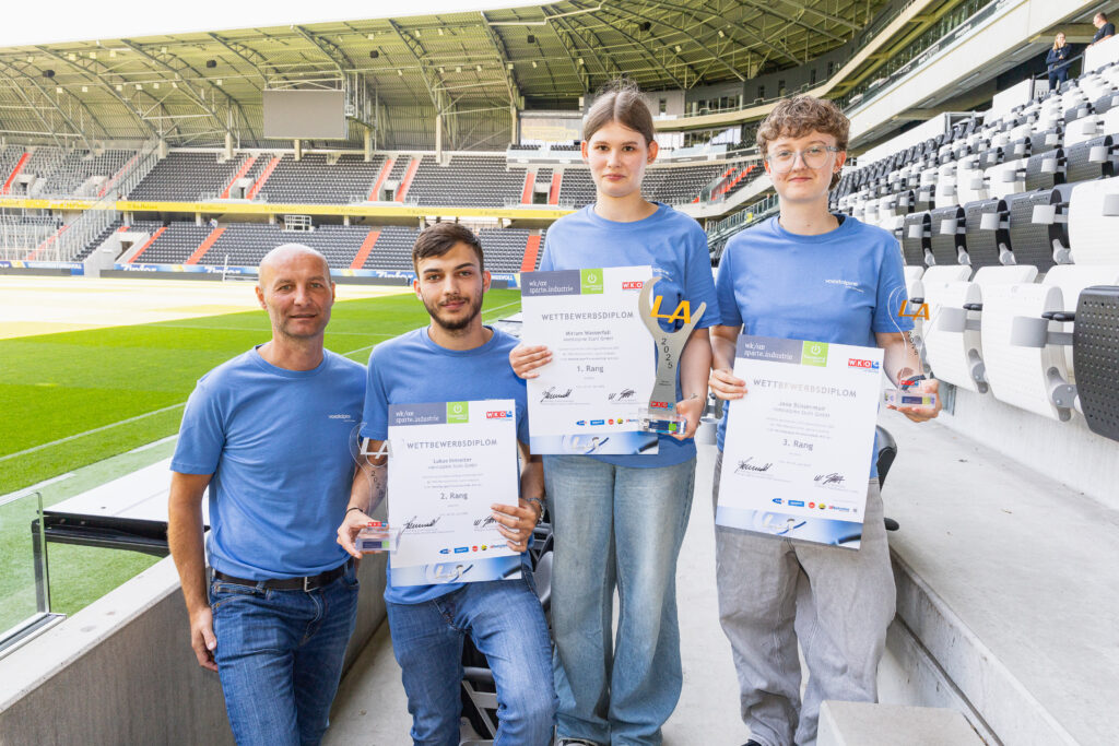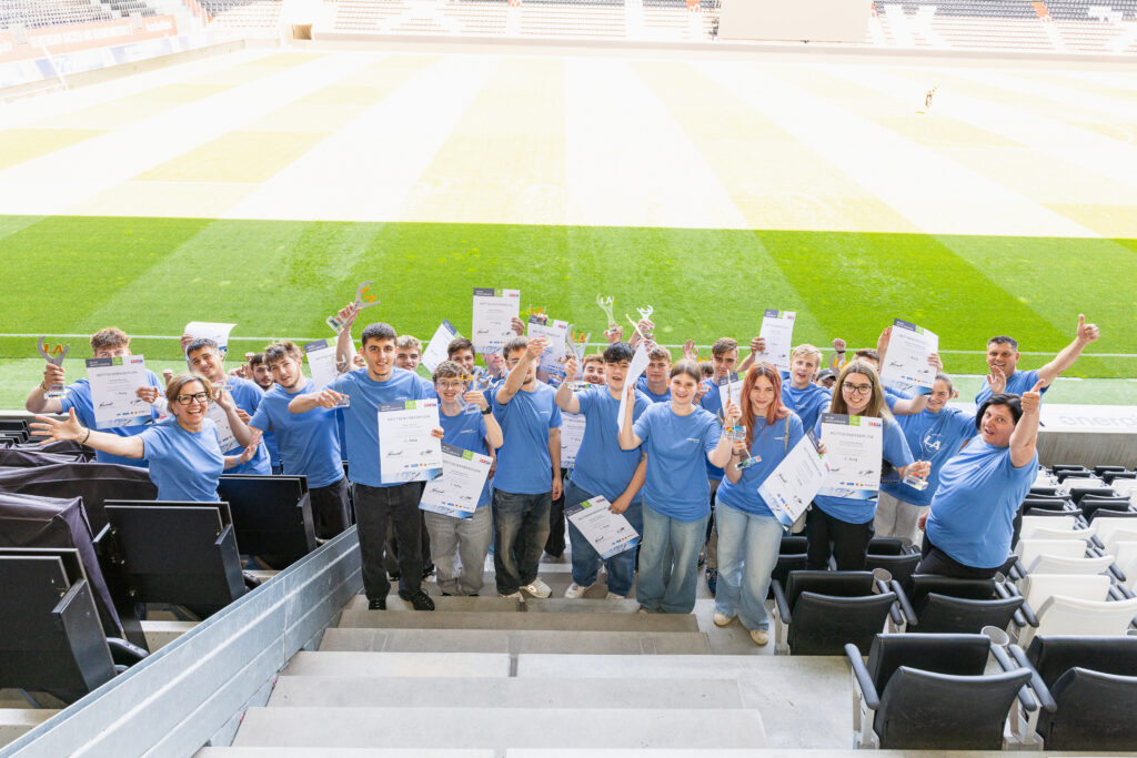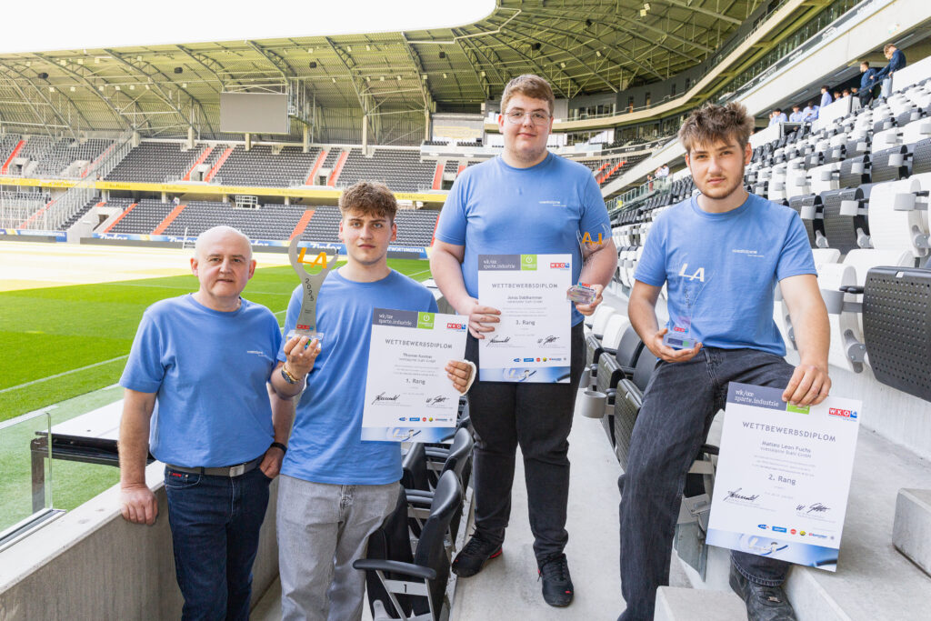 Zur Feier des Tages haben sich die Sieger:innen in ein einheitliches junges Galaoutfit mit voestalpine-T-Shirts geworfen. Was bei der Preisverleihung im Business Club des LASK-Stadions besonders ins Auge stach, war die starke Präsenz unserer Lehrlinge in allen Lehrberufen: Elektrotechnik, Mechatronik, Prozesstechnik, Metalltechnik mit Schwerpunkt Maschinenbautechnik, Stahlbautechnik, Schweißtechnik, Zerspanungstechnik sowie im Bereich Industriekauffrau/Industriekaufmann.