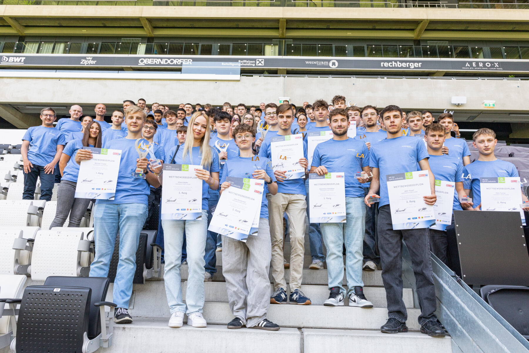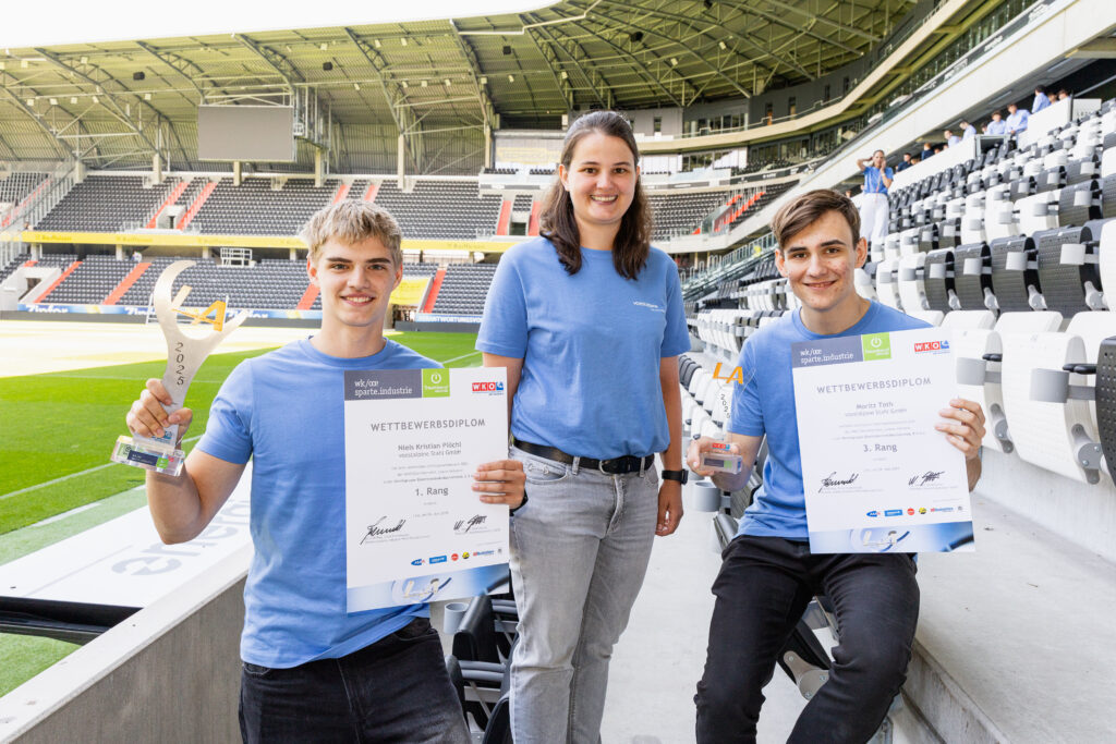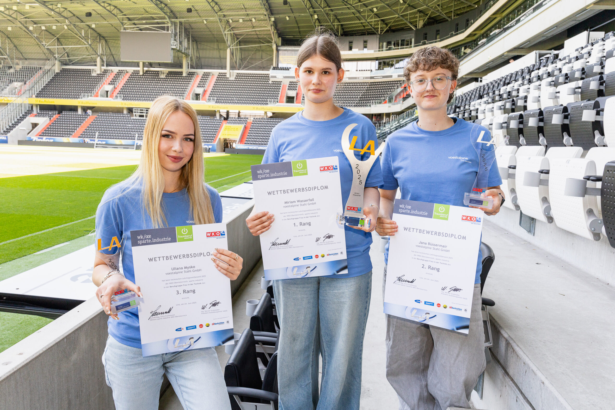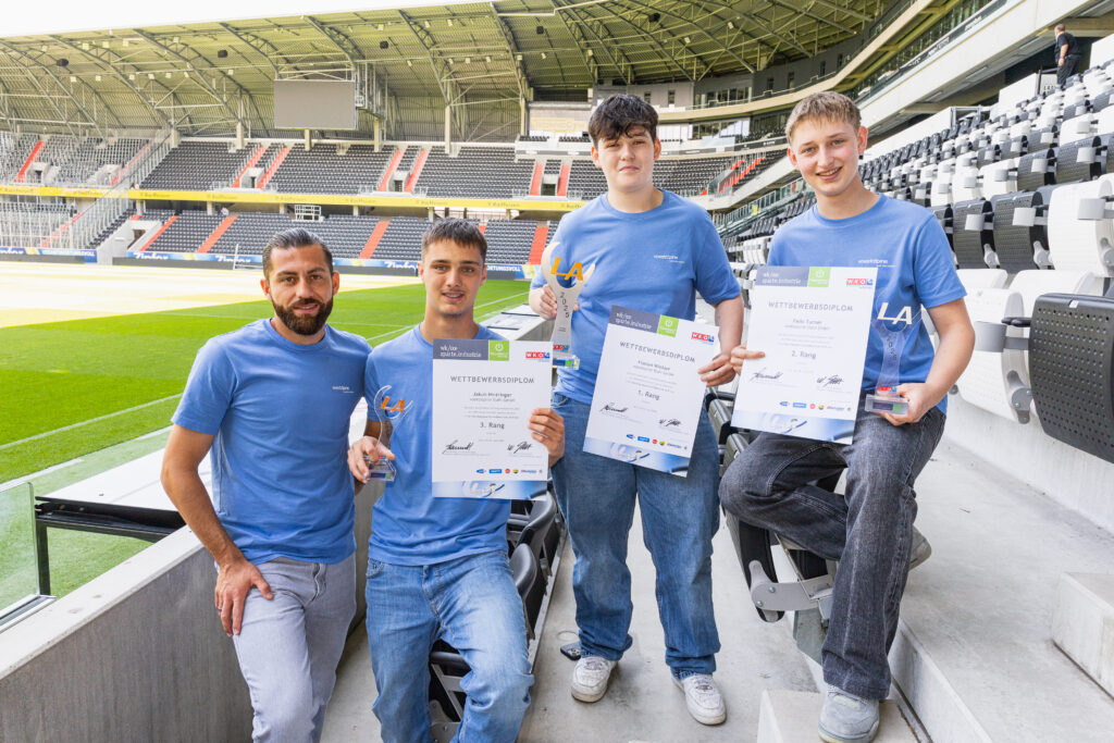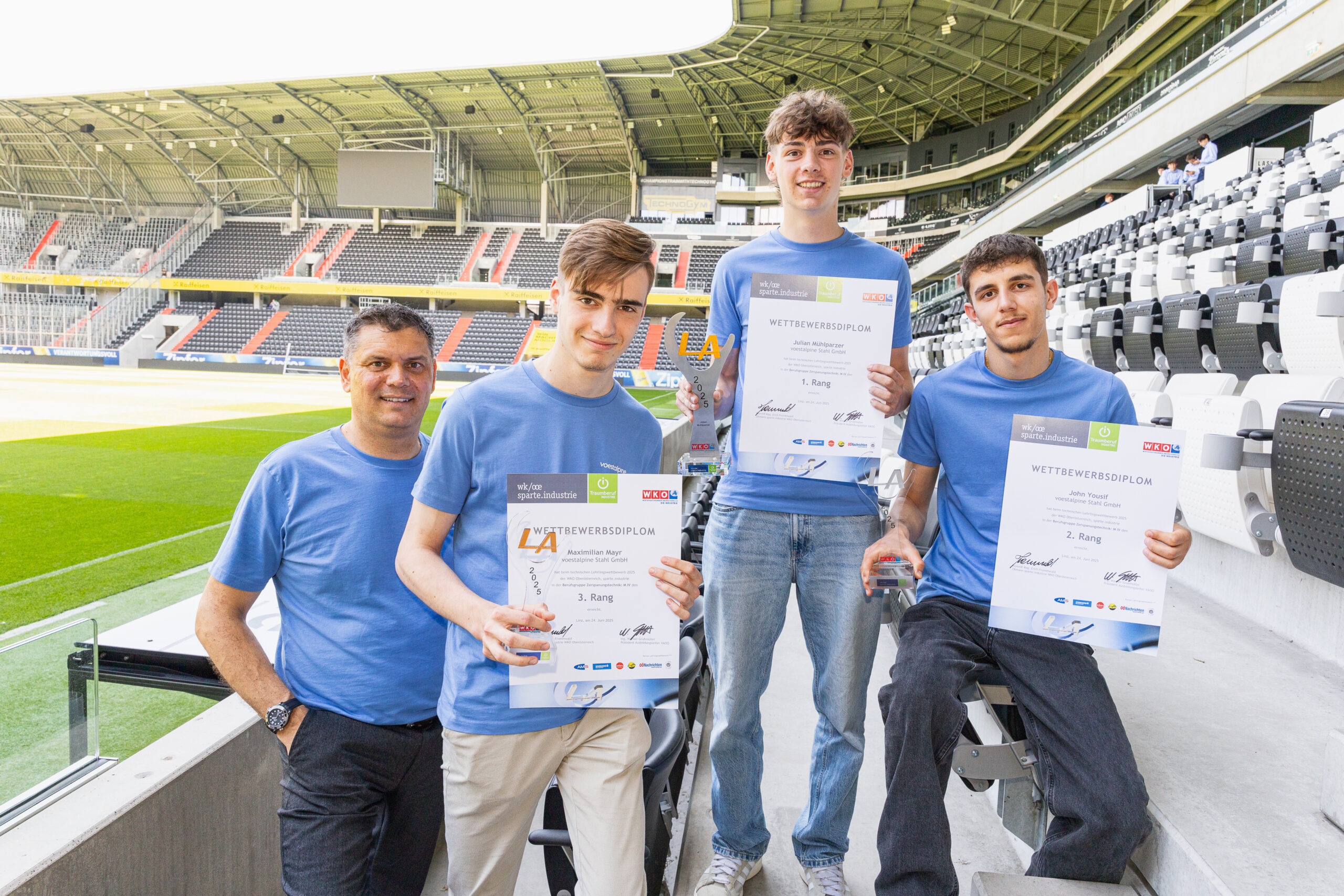 Zur Feier des Tages haben sich die Sieger:innen in ein einheitliches junges Galaoutfit mit voestalpine-T-Shirts geworfen. Was bei der Preisverleihung im Business Club des LASK-Stadions besonders ins Auge stach, war die starke Präsenz unserer Lehrlinge in allen Lehrberufen: Elektrotechnik, Mechatronik, Prozesstechnik, Metalltechnik mit Schwerpunkt Maschinenbautechnik, Stahlbautechnik, Schweißtechnik, Zerspanungstechnik sowie im Bereich Industriekauffrau/Industriekaufmann.